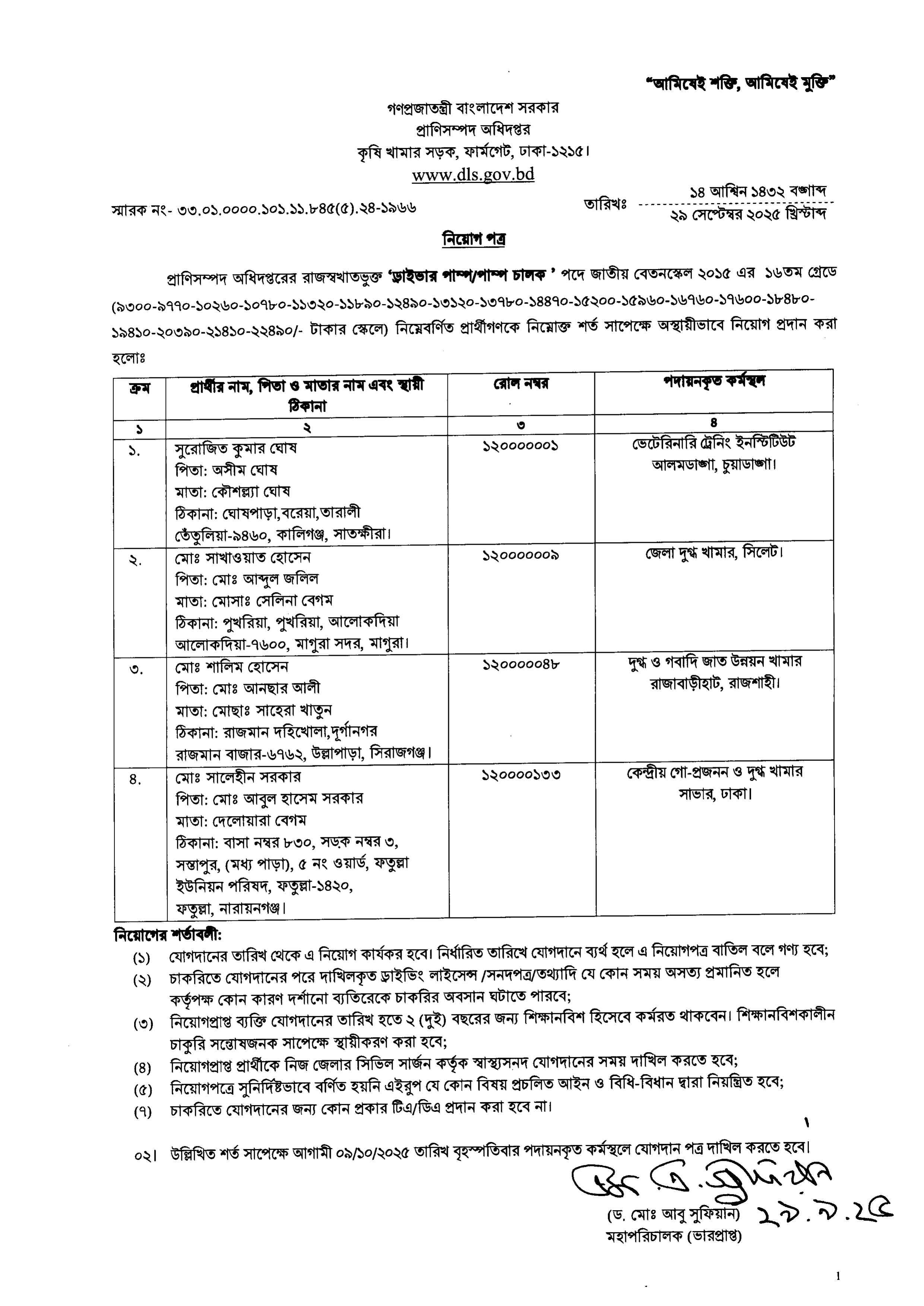 এই নিয়োগপত্র অনুযায়ী, নিয়োগপ্রাপ্ত প্রার্থীদেরকে আগামী ০৯/১০/২০২৫ তারিখ বৃহস্পতিবার পদায়নকৃত কর্মস্থলে যোগদানপত্র দাখিল করতে হবে।