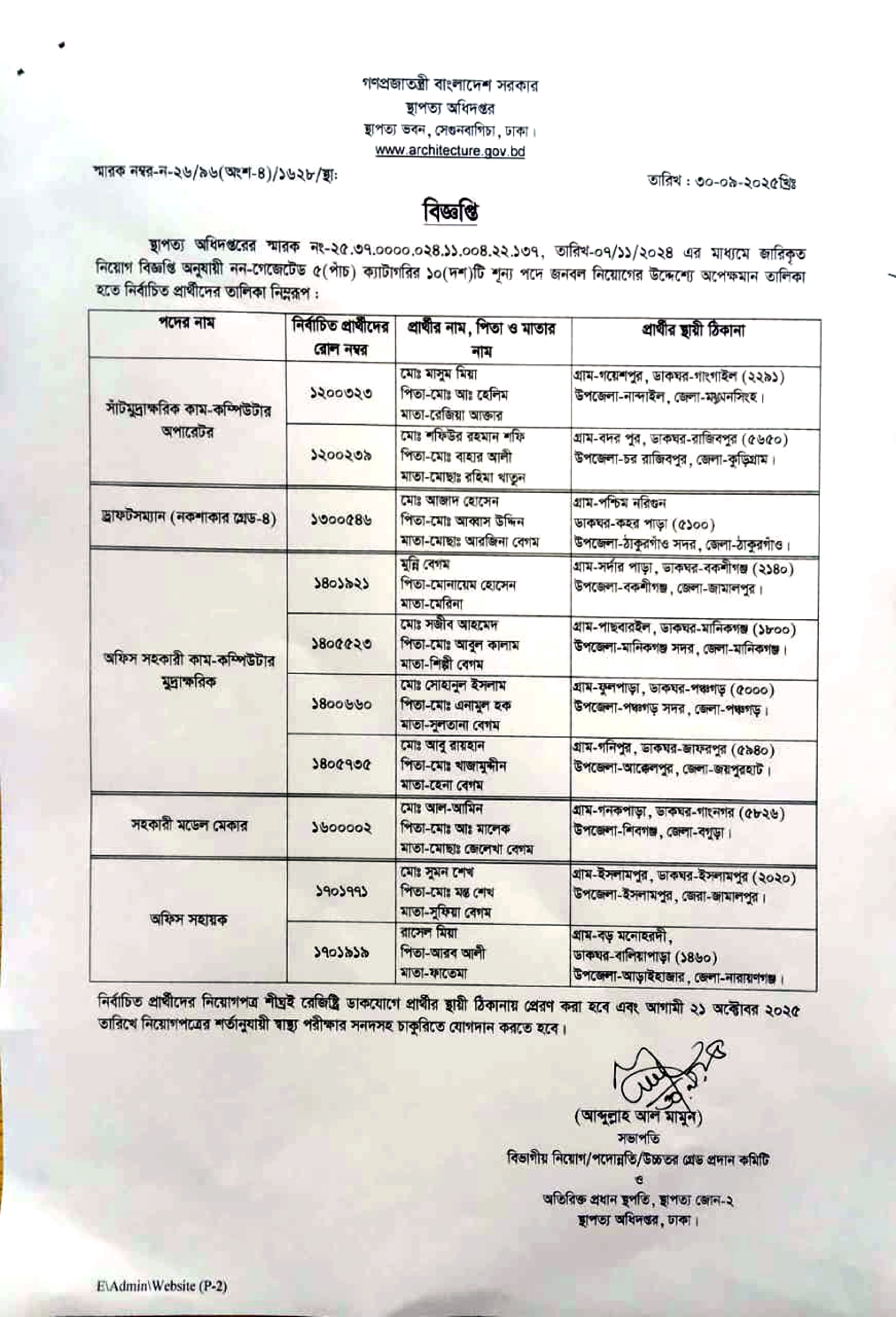 স্থাপত্য অধিদপ্তরের পূর্বের নিয়োগ বিজ্ঞপ্তি অনুযায়ী ৫টি ক্যাটাগরির ১০টি শূন্য পদে জনবল নিয়োগের লক্ষ্যে অপেক্ষমান তালিকা থেকে নির্বাচিত প্রার্থীদের তালিকা প্রকাশ করা হয়েছে।