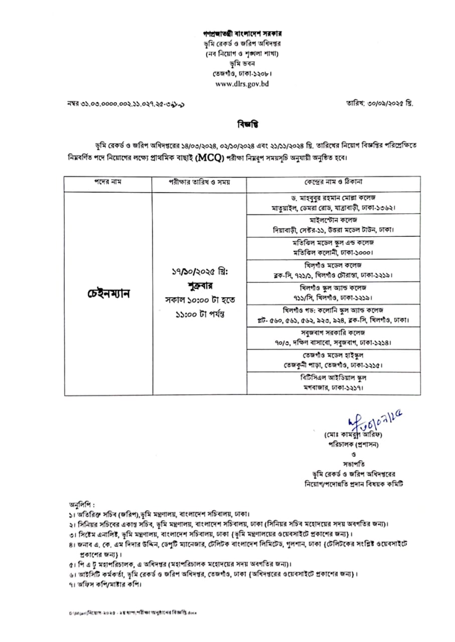 ২৭১১ পদে ভূমি রেকর্ড ও জরিপ অধিদপ্তরের চাকরির MCQ পরীক্ষার সময়সূচি প্রকাশ