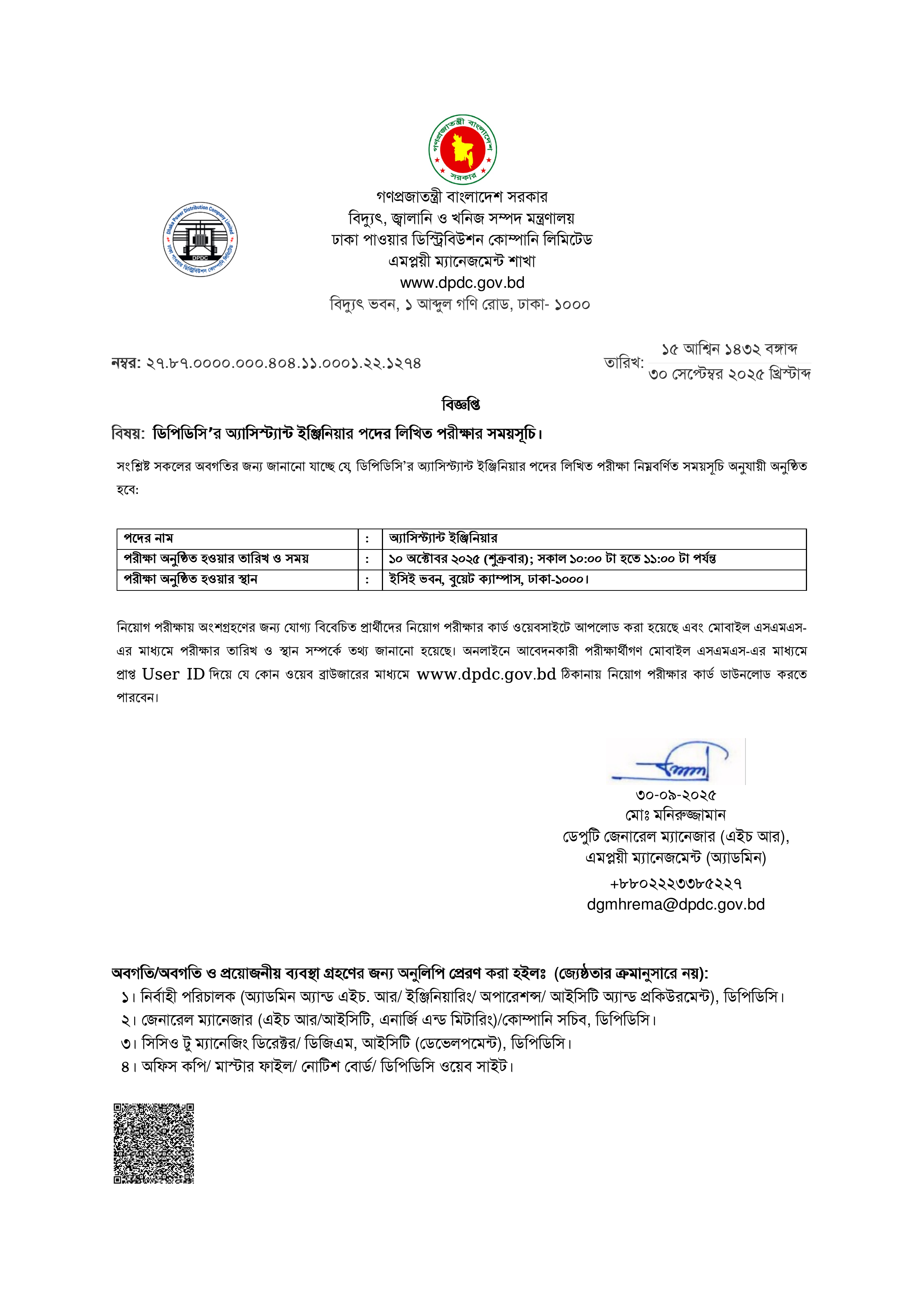 সংশ্লিষ্ট সকলের অবগতির জন্য জানানো যাচ্ছে যে, ঢাকা পাওয়ার ডিস্ট্রিবিউশন কোম্পানি লিমিটেড (ডিপিডিসি)-এর অ্যাসিস্ট্যান্ট ইঞ্জিনিয়ার পদের লিখিত পরীক্ষার সময়সূচি প্রকাশ করা হয়েছে।