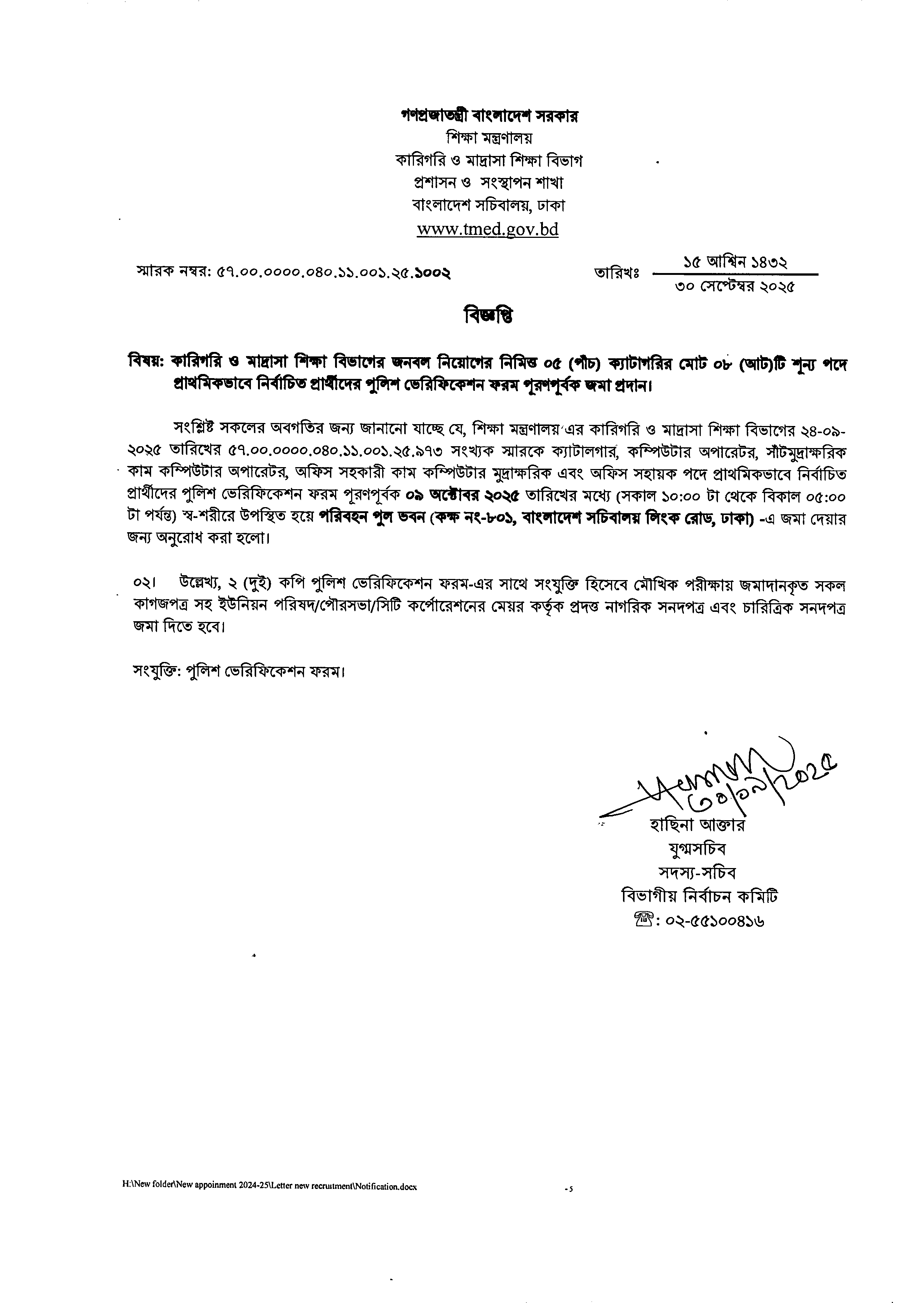শিক্ষা মন্ত্রণালয়ের কারিগরি ও মাদ্রাসা শিক্ষা বিভাগের জনবল নিয়োগের জন্য প্রাথমিকভাবে নির্বাচিত ০৫টি ক্যাটাগরির মোট ০৮টি শূন্য পদে পুলিশ ভেরিফিকেশন ফরম পূরণের নির্দেশ দেওয়া হয়েছে।