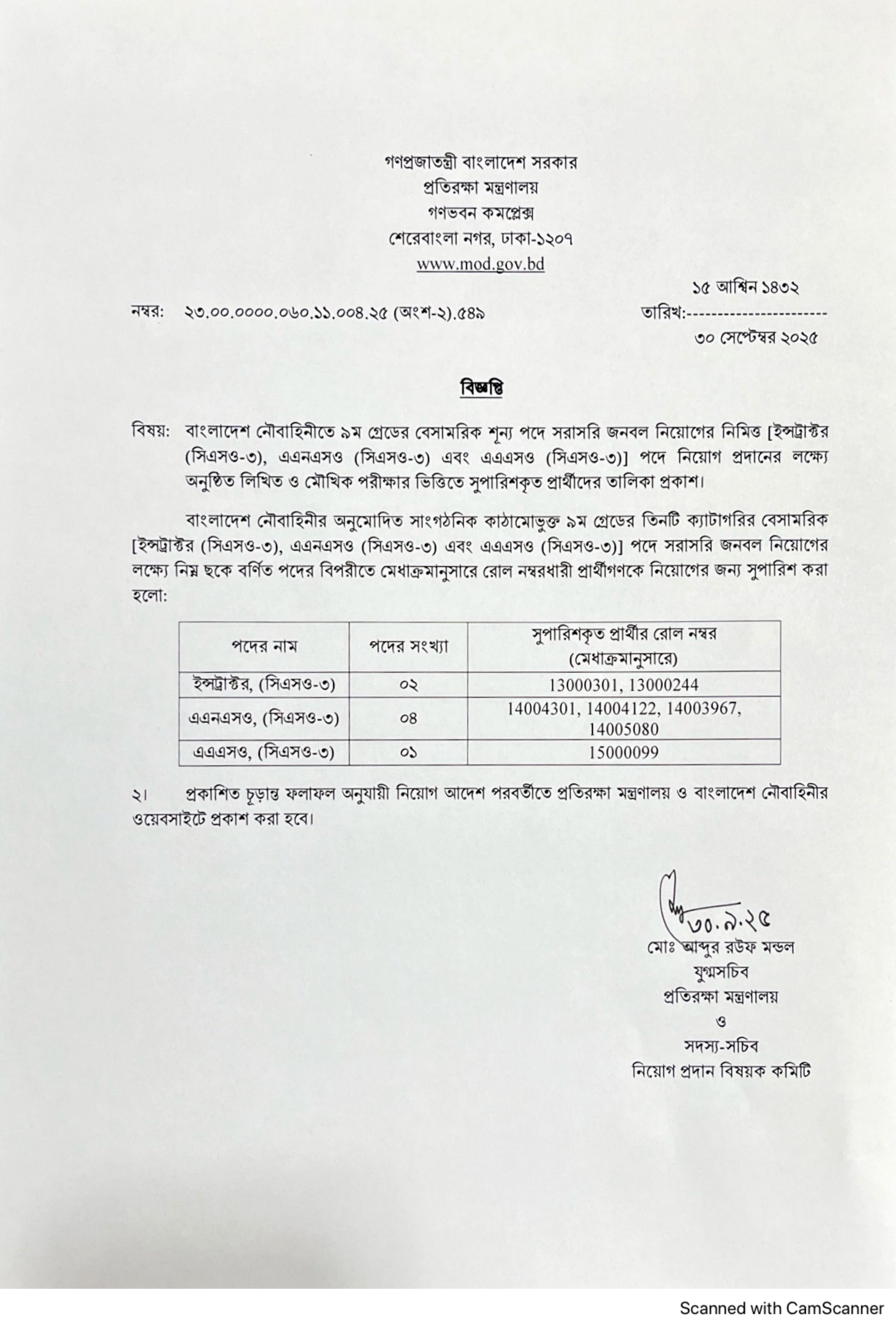 প্রতিরক্ষা মন্ত্রণালয়ের অধীনে বাংলাদেশ নৌবাহিনীর অনুমোদিত সাংগঠনিক কাঠামোভুক্ত ৯ম গ্রেডের তিনটি ক্যাটাগরির বেসামরিক পদের (ইন্সট্রাক্টর (সিএসও-৩), এএনএসও (সিএসও-৩) এবং এএএসও (সিএসও-৩)) সরাসরি জনবল নিয়োগের লক্ষ্যে অনুষ্ঠিত লিখিত ও মৌখিক পরীক্ষার ভিত্তিতে সুপারিশকৃত প্রার্থীদের তালিকা প্রকাশ করা হয়েছে।