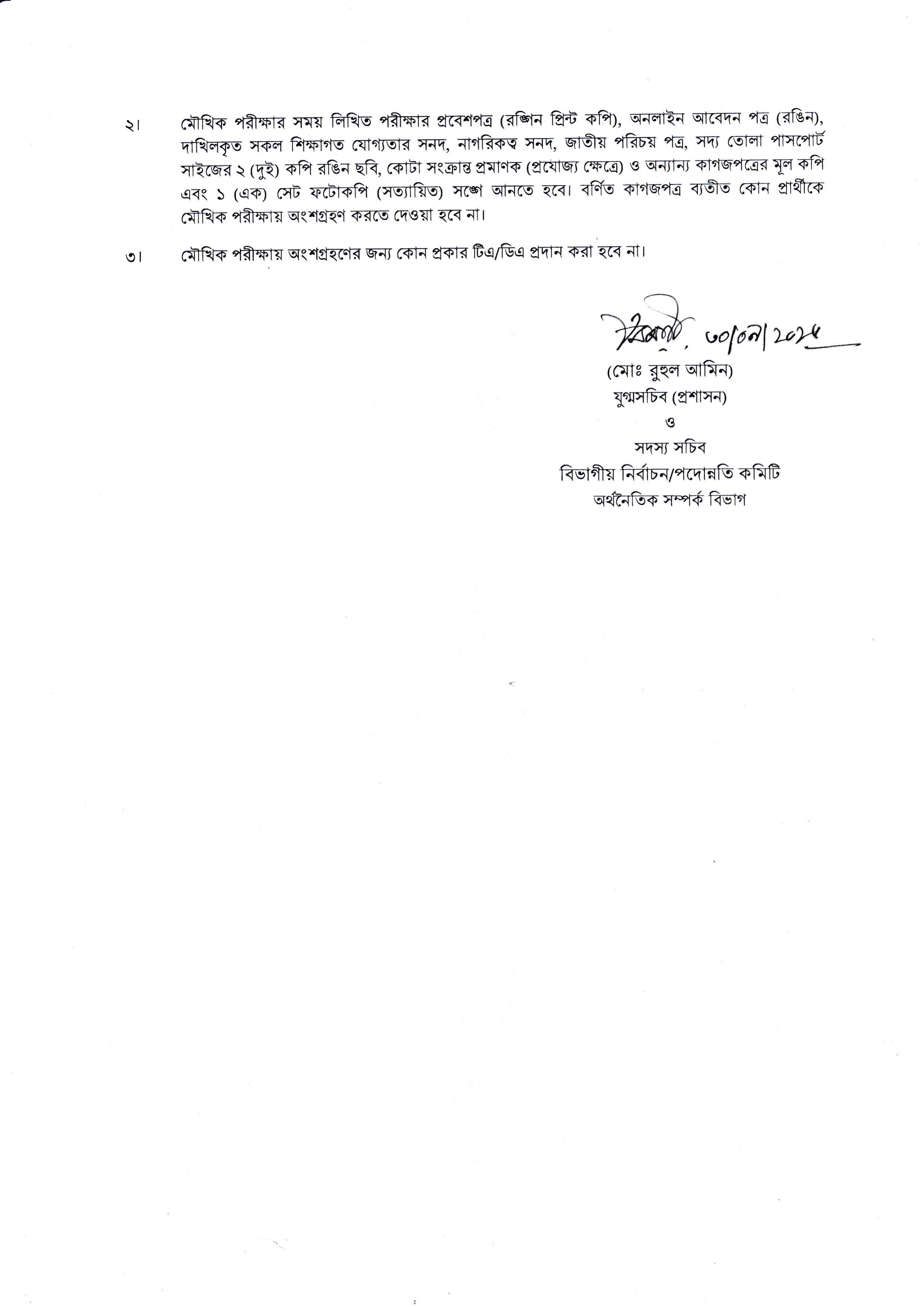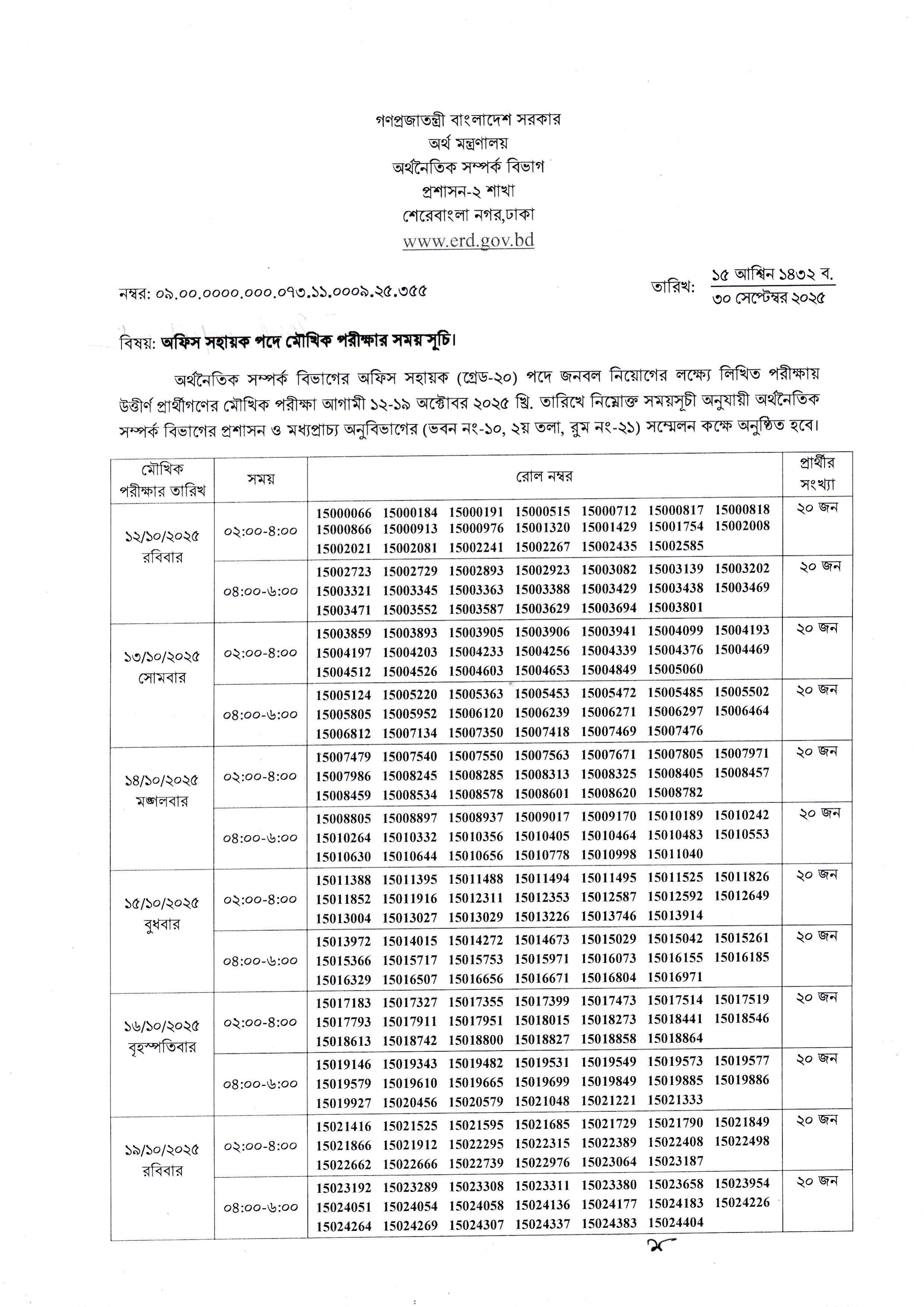 এই মৌখিক পরীক্ষা ১২ অক্টোবর ২০২৫ থেকে ১৯ অক্টোবর ২০২৫ পর্যন্ত নিম্নোক্ত সময়সূচী অনুযায়ী অর্থনৈতিক সম্পর্ক বিভাগের প্রশাসন ও মধ্যপ্রাচ্য অনুবিভাগের (ভবন নং-১০, ২য় তলা, রুম নং-২১) সম্মেলন কক্ষে অনুষ্ঠিত হবে।