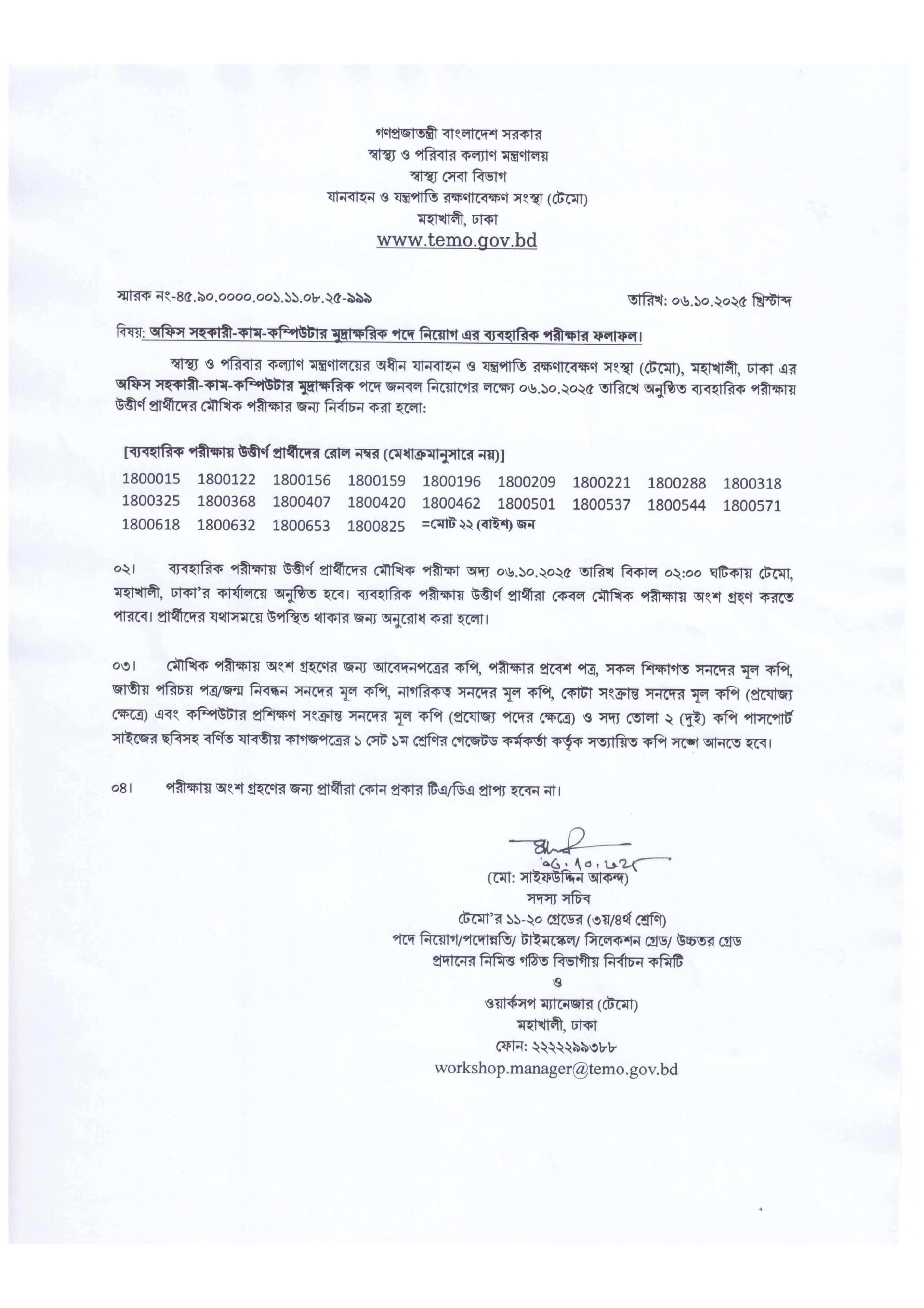 স্বাস্থ্য ও পরিবার কল্যাণ মন্ত্রণালয়ের অধীন যানবাহন ও যন্ত্রপাতি রক্ষণাবেক্ষণ সংস্থা (টেমো), মহাখালী, ঢাকা এর অফিস সহকারী-কাম-কম্পিউটার মুদ্রাক্ষরিক পদে জনবল নিয়োগের লক্ষ্যে ০৬.১০.২০২৫ তারিখে অনুষ্ঠিত ব্যবহারিক পরীক্ষার ফলাফল প্রকাশ করা হয়েছে।
