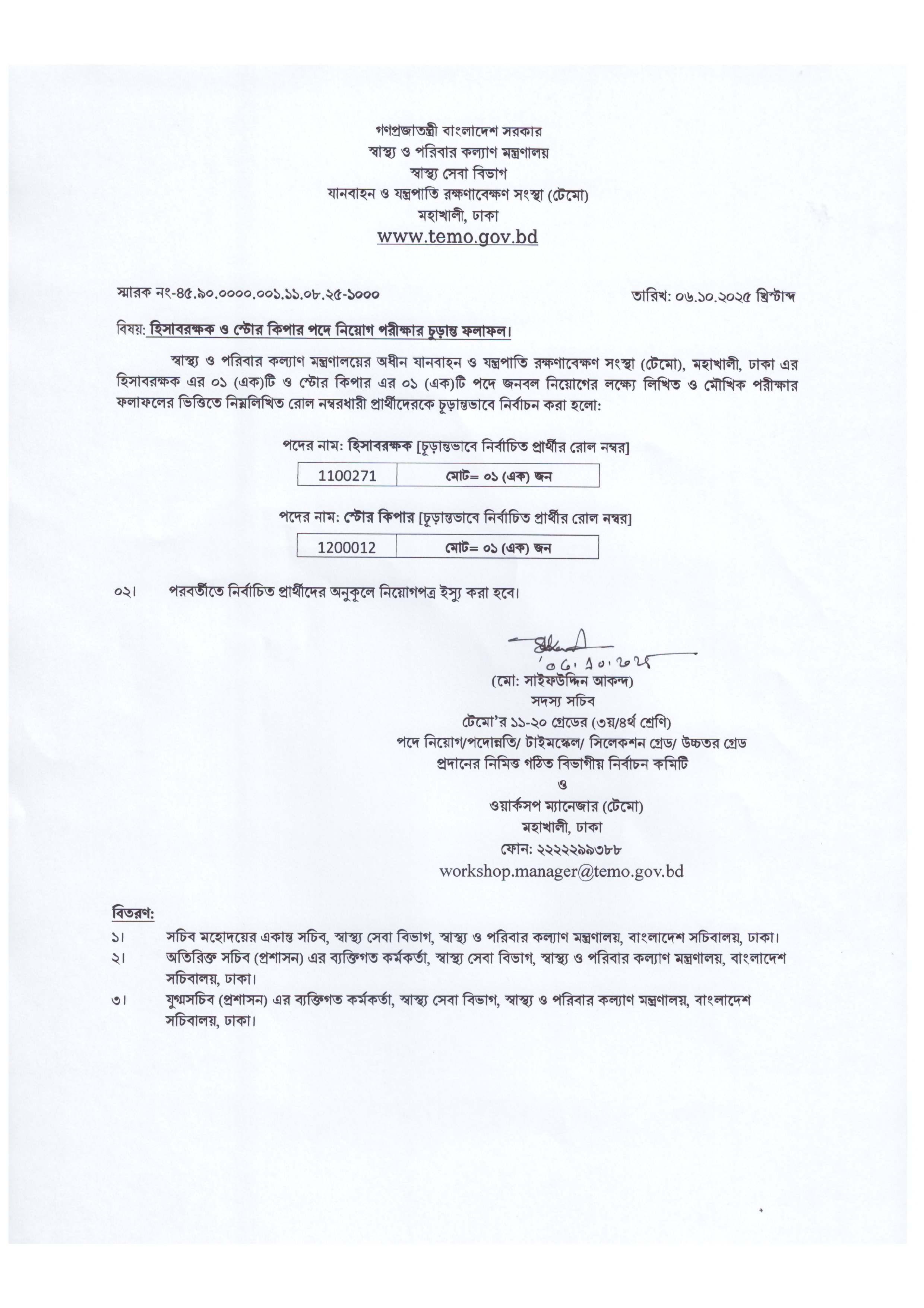 স্বাস্থ্য ও পরিবার কল্যাণ মন্ত্রণালয়ের অধীন যানবাহন ও যন্ত্রপাতি রক্ষণাবেক্ষণ সংস্থা (টেমো), মহাখালী, ঢাকা এর হিসাবরক্ষক (০১ টি) এবং স্টোর কিপার (০১ টি) পদে জনবল নিয়োগের লক্ষ্যে অনুষ্ঠিত লিখিত ও মৌখিক পরীক্ষার চূড়ান্ত ফলাফল প্রকাশ করা হয়েছে।