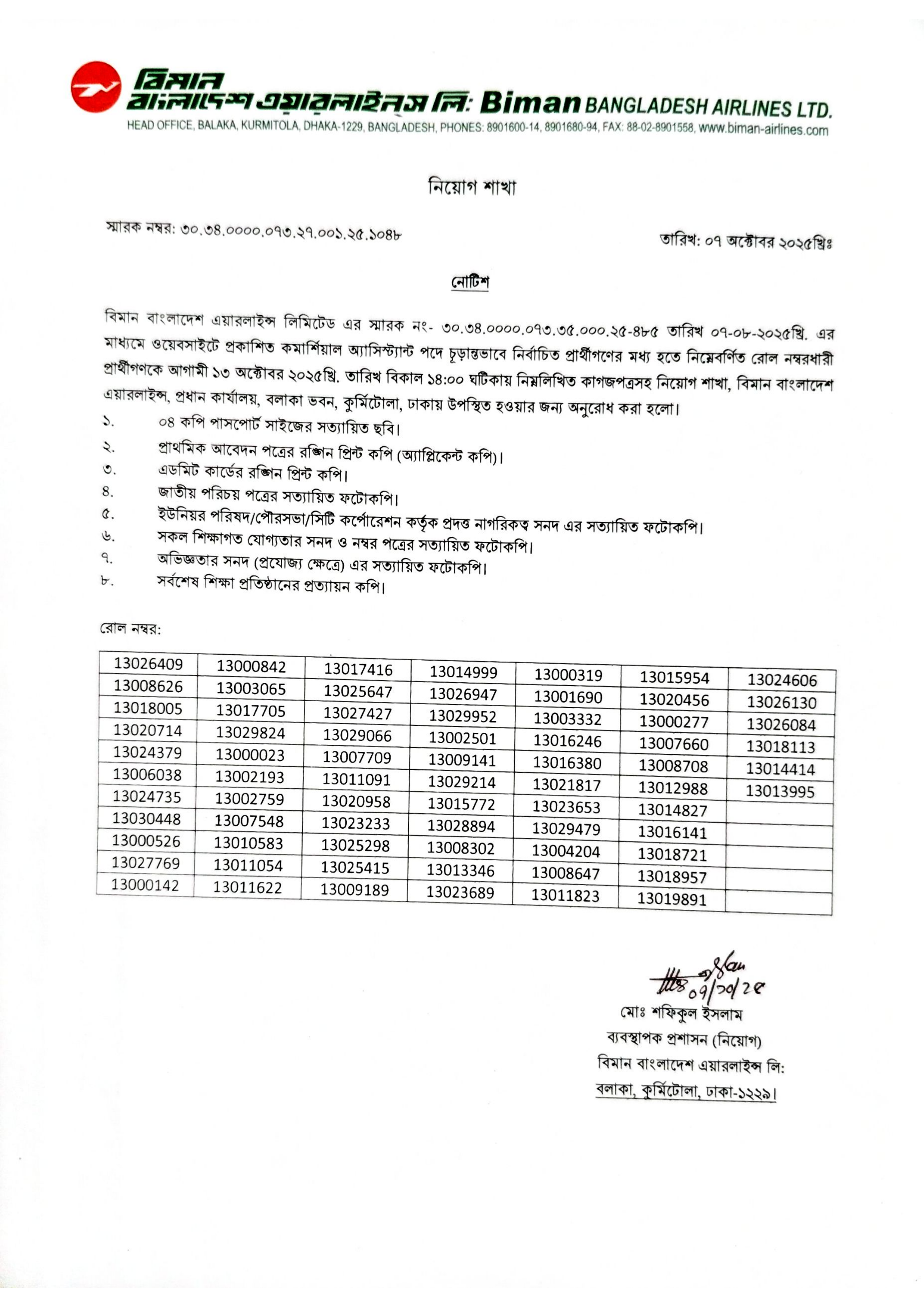 বিমান বাংলাদেশ এয়ারলাইন্স লিমিটেডের কমার্শিয়াল অ্যাসিস্ট্যান্ট পদে চূড়ান্তভাবে নির্বাচিত প্রার্থীদের জন্য জরুরি ঘোষণা প্রকাশিত হয়েছে। বিজ্ঞপ্তিতে নির্বাচিত প্রার্থীদের কিছু প্রয়োজনীয় কাগজপত্রসহ নির্দিষ্ট তারিখে উপস্থিত হতে বলা হয়েছে।