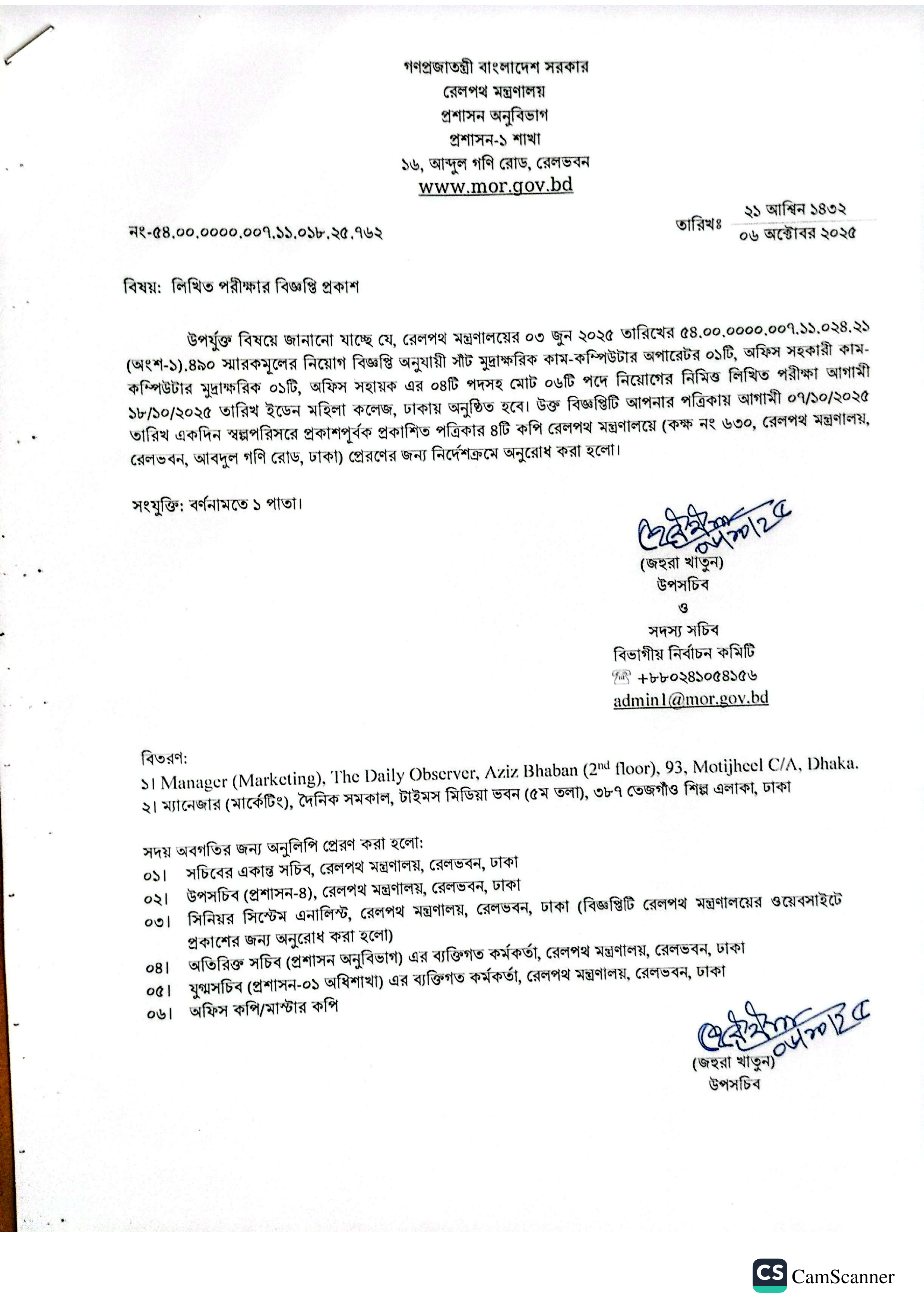 রেলপথ মন্ত্রণালয়ের বিভিন্ন পদে নিয়োগের নিমিত্ত লিখিত পরীক্ষার তারিখ, সময় ও স্থান সংক্রান্ত বিজ্ঞপ্তি প্রকাশিত হয়েছে।