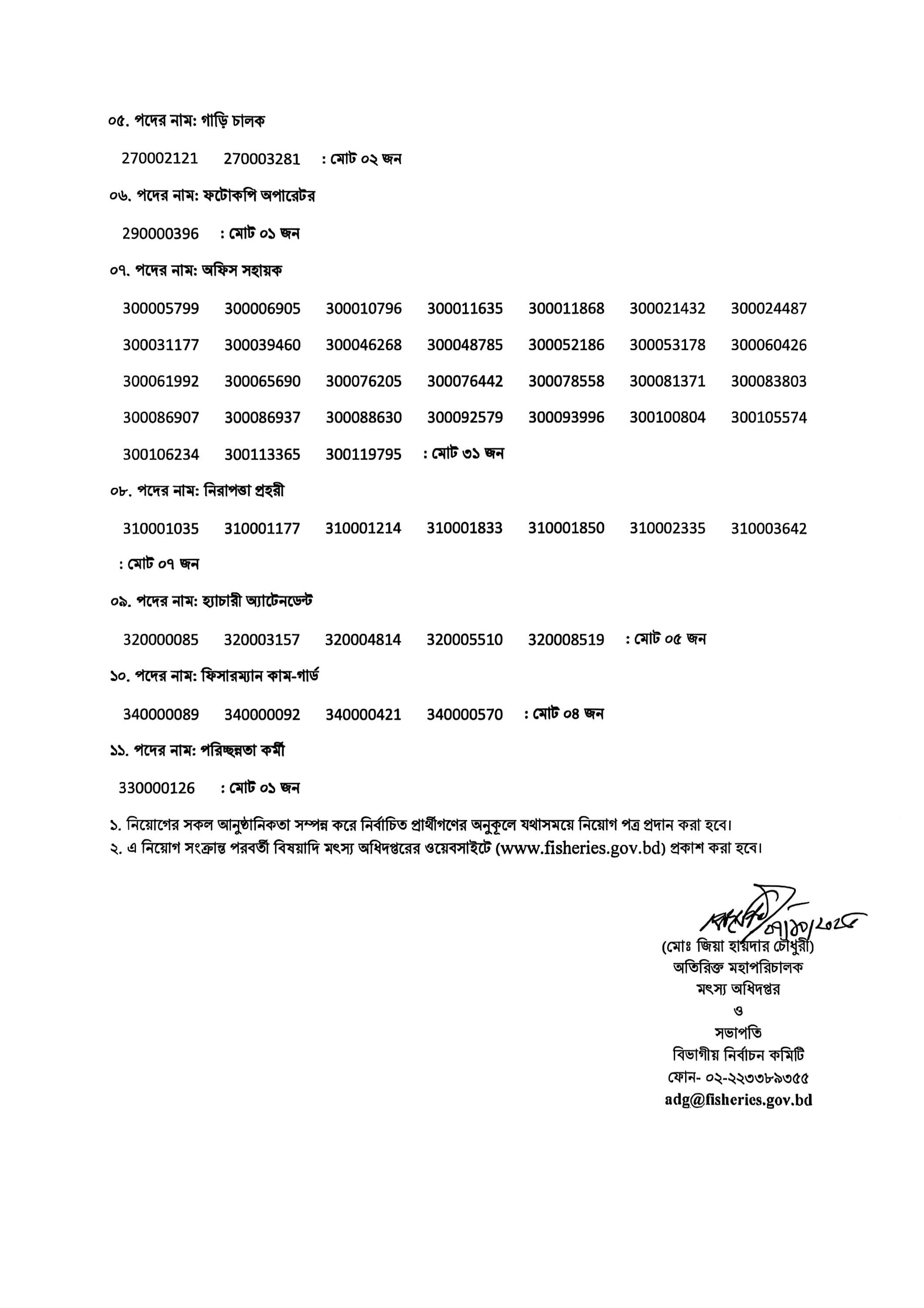 নিয়োগের সকল আনুষ্ঠানিকতা সম্পন্ন করে নির্বাচিত প্রার্থীগণের অনুকূলে যথাসময়ে নিয়োগ পত্র প্রদান করা হবে। এ নিয়োগ সংক্রান্ত পরবর্তী সকল তথ্য মৎস্য অধিদপ্তরের ওয়েবসাইটে (www.fisheries.gov.bd) প্রকাশ করা হবে।