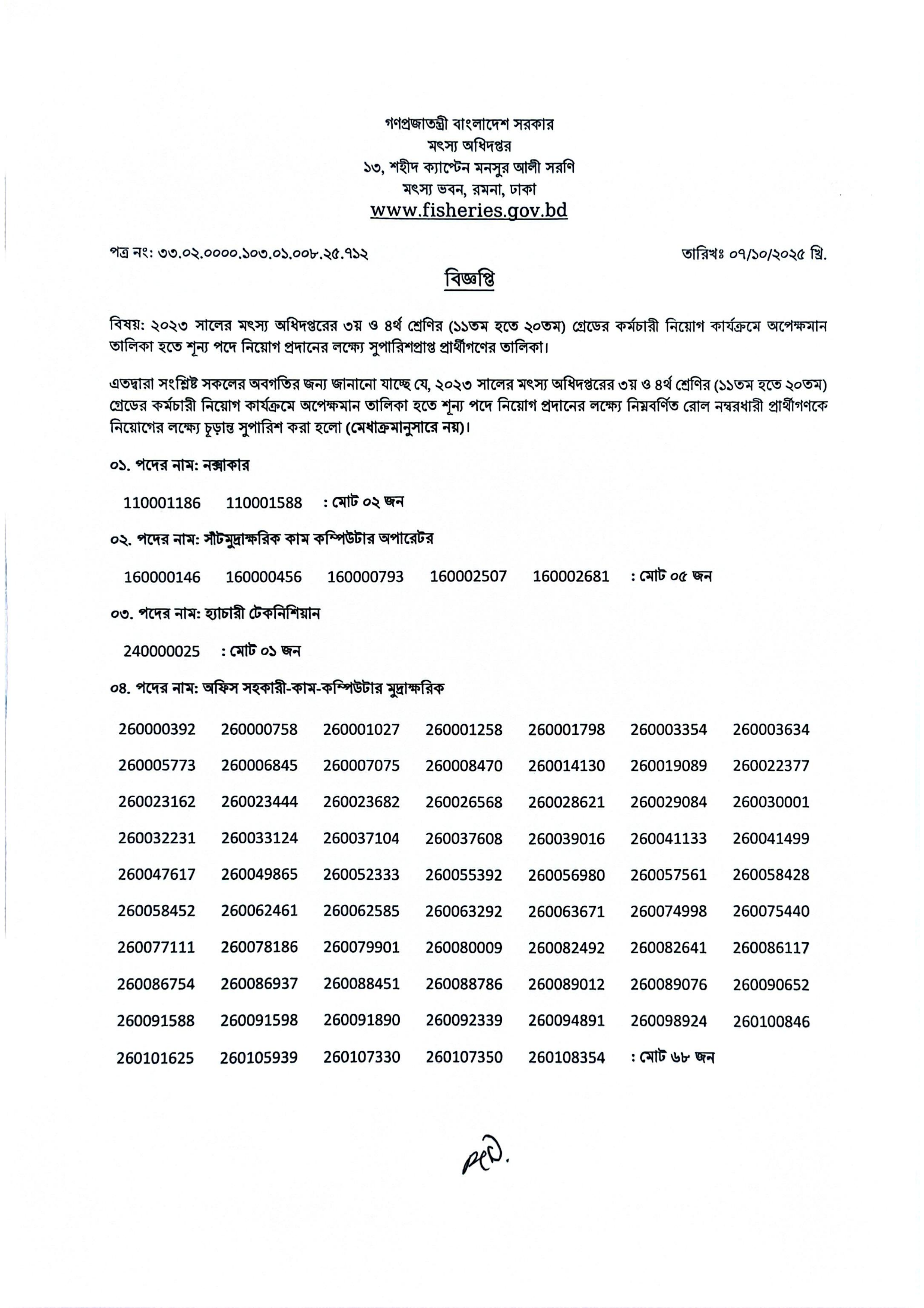 মৎস্য অধিদপ্তরের ২০২৩ সালের ৩য় ও ৪র্থ শ্রেণির (১১তম হতে ২০তম) গ্রেডের কর্মচারী নিয়োগ কার্যক্রমে অপেক্ষমান তালিকা থেকে শূন্য পদে নিয়োগ প্রদানের লক্ষ্যে নিম্নোক্ত পদসমূহে মোট ১২৪ জন প্রার্থীকে চূড়ান্ত সুপারিশ করা হয়েছে।