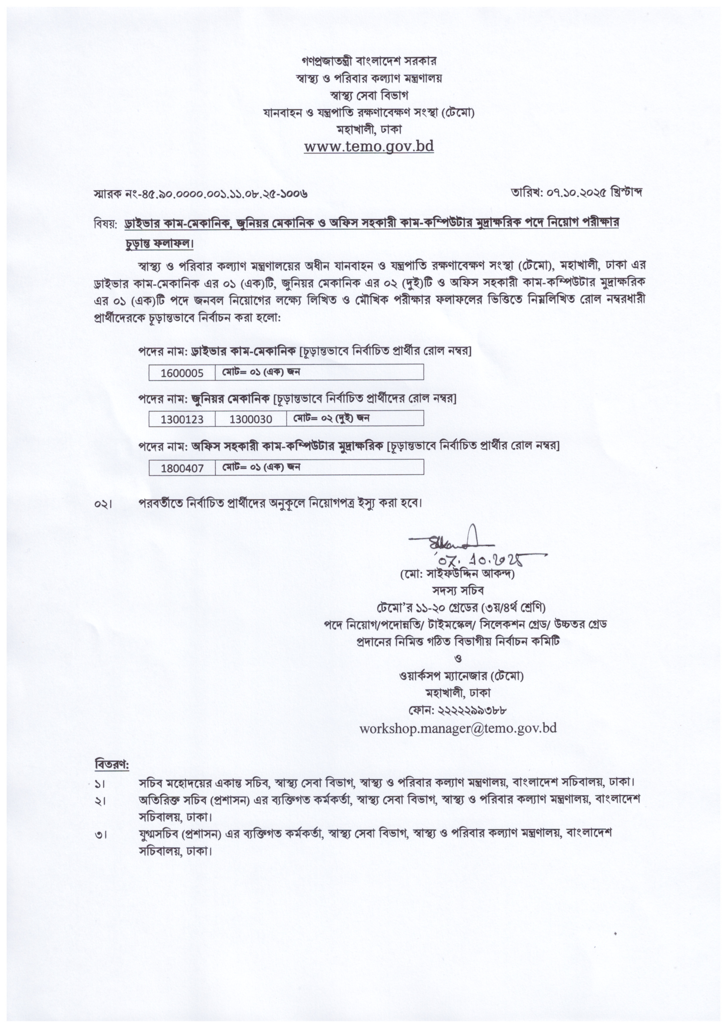 স্বাস্থ্য ও পরিবার কল্যাণ মন্ত্রণালয়ের অধীন যানবাহন ও যন্ত্রপাতি রক্ষণাবেক্ষণ সংস্থা (টেমো) এর বিভিন্ন পদে জনবল নিয়োগের লক্ষ্যে অনুষ্ঠিত লিখিত ও মৌখিক পরীক্ষার চূড়ান্ত ফলাফল প্রকাশিত হয়েছে।