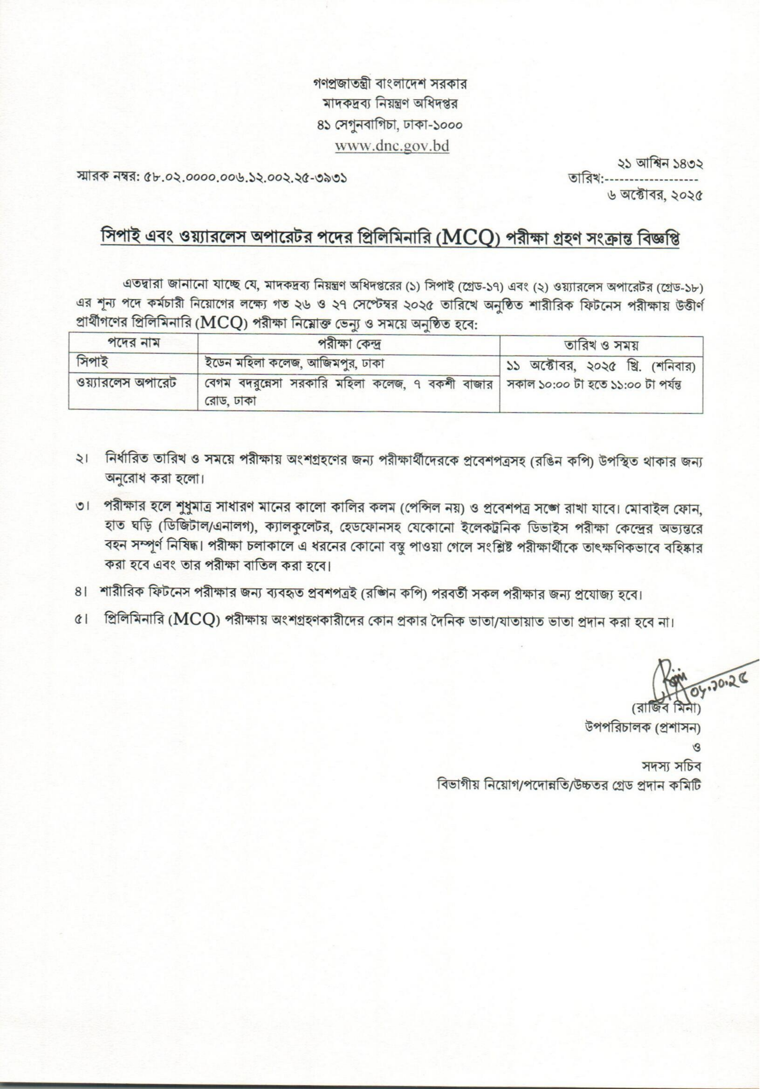মাদকদ্রব্য নিয়ন্ত্রণ অধিদপ্তরের (DNC) সিপাই (গ্রেড-১৭) এবং ওয়্যারলেস অপারেটর (গ্রেড-১৮) এর শূন্য পদে জনবল নিয়োগের লক্ষ্যে শারীরিক ফিটনেস পরীক্ষায় উত্তীর্ণ প্রার্থীদের প্রিলিমিনারি (MCQ) পরীক্ষার সময়সূচি প্রকাশিত হয়েছে।