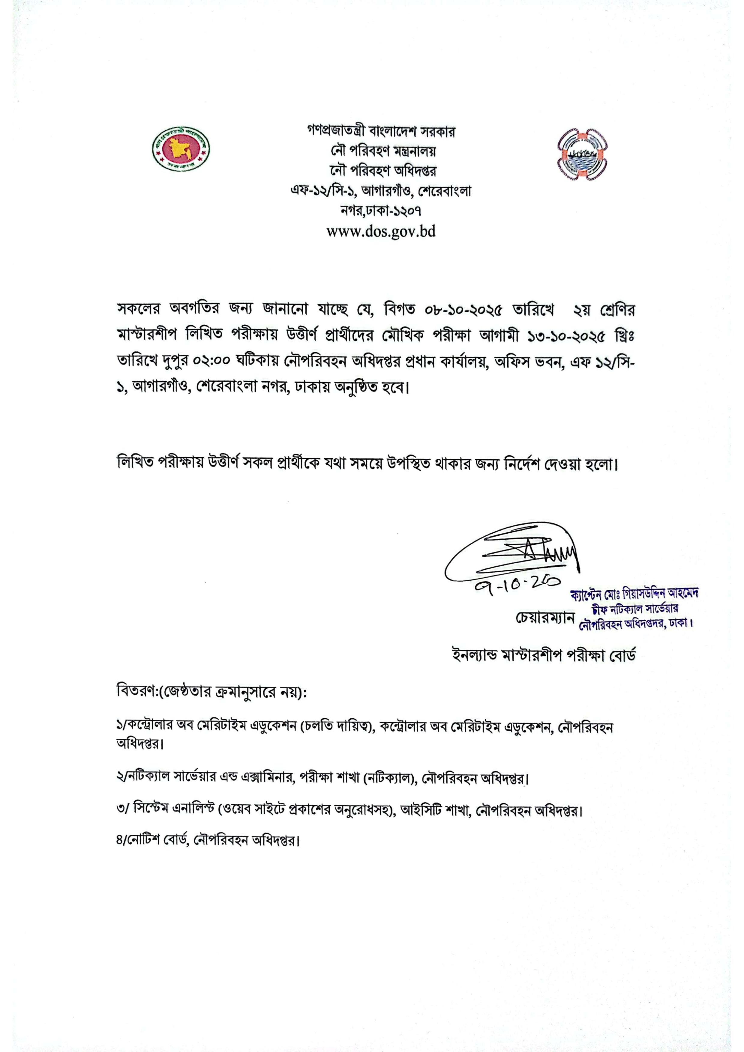 নৌপরিবহন অধিদপ্তর কর্তৃক বিগত ০৮ অক্টোবর ২০২৫ তারিখে অনুষ্ঠিত ২য় শ্রেণির মাস্টারশীপ লিখিত পরীক্ষায় উত্তীর্ণ প্রার্থীদের মৌখিক পরীক্ষার সময়সূচী প্রকাশ করা হয়েছে।
