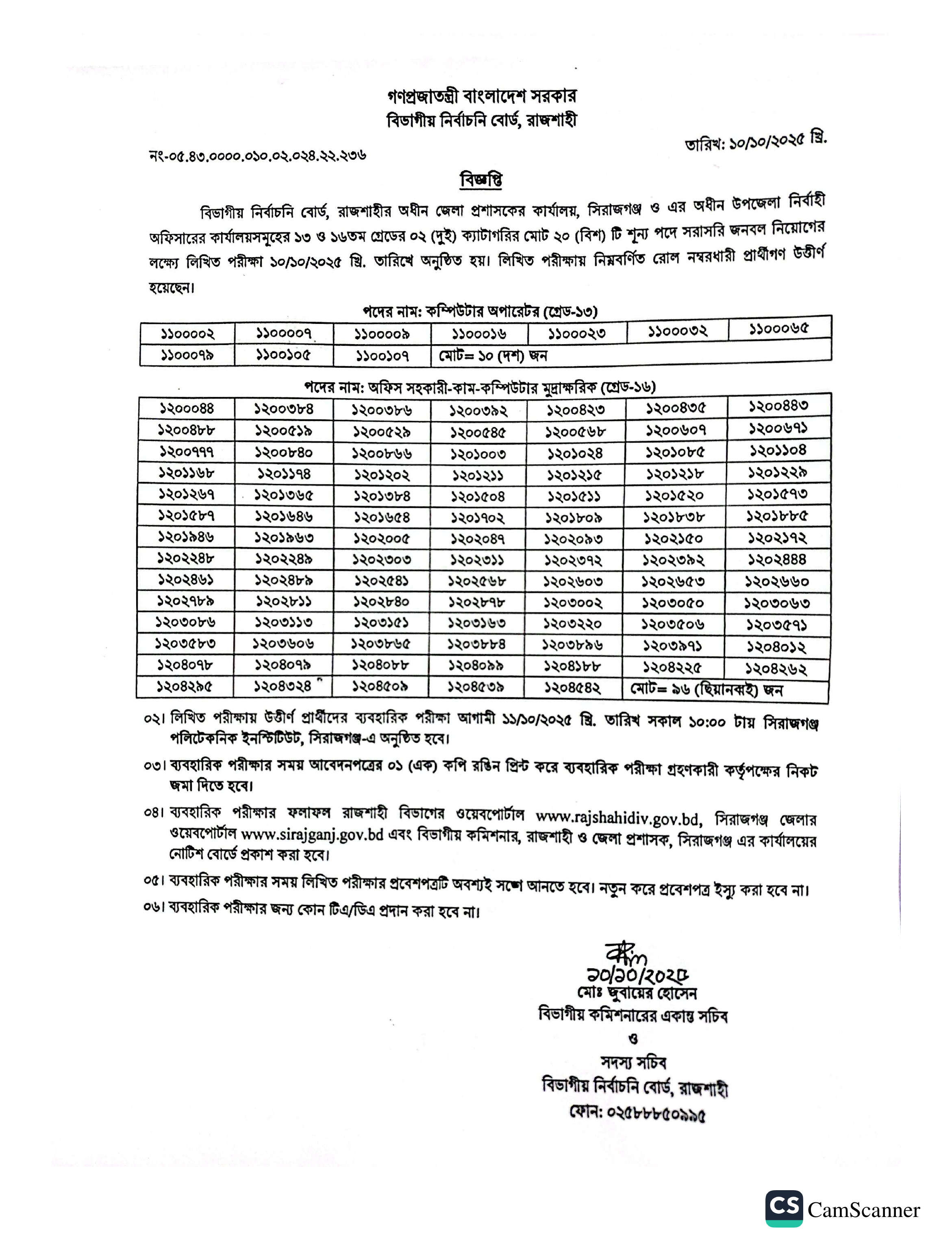 বিভাগীয় নির্বাচনি বোর্ড, রাজশাহীর অধীন জেলা প্রশাসকের কার্যালয়, সিরাজগঞ্জ ও এর অধীন উপজেলা নির্বাহী অফিসারের কার্যালয়সমূহের ১৩ ও ১৬তম গ্রেডের মোট ২০ (বিশ) টি শূন্য পদে জনবল নিয়োগের লক্ষ্যে অনুষ্ঠিত লিখিত পরীক্ষার ফলাফল প্রকাশ করা হয়েছে।