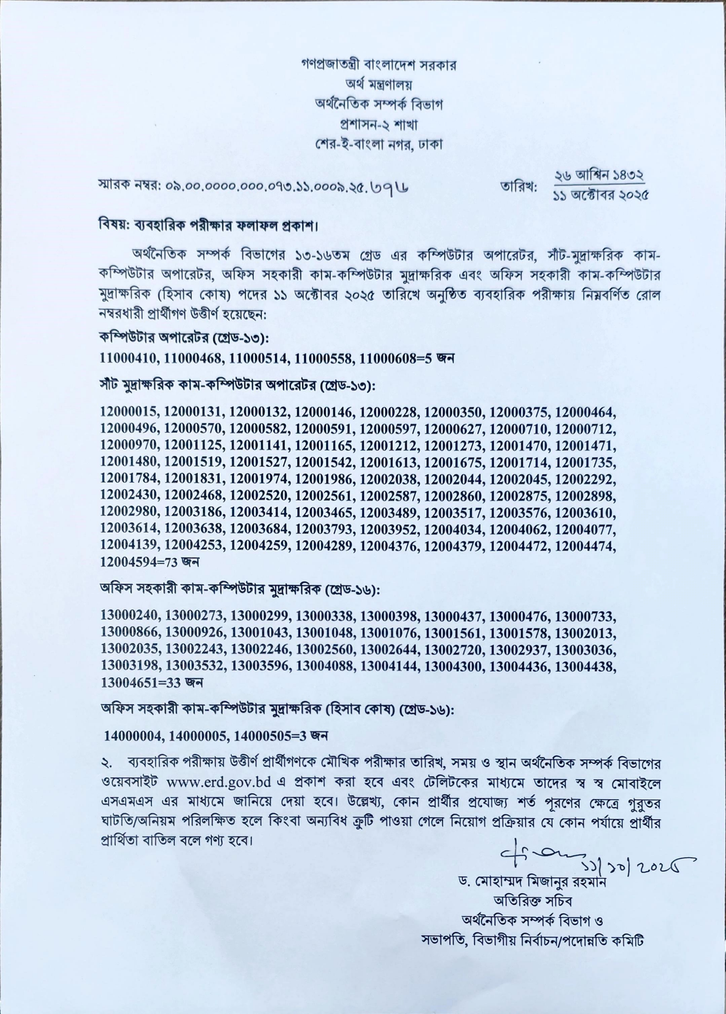 অর্থনৈতিক সম্পর্ক বিভাগের ১৩-১৬তম গ্রেড এর বিভিন্ন পদের ব্যবহারিক পরীক্ষার ফলাফল প্রকাশ করা হয়েছে। গত ১১ অক্টোবর ২০২৫ তারিখে অনুষ্ঠিত এ পরীক্ষায় মোট ১৬৪ জন প্রার্থী উত্তীর্ণ হয়েছেন।