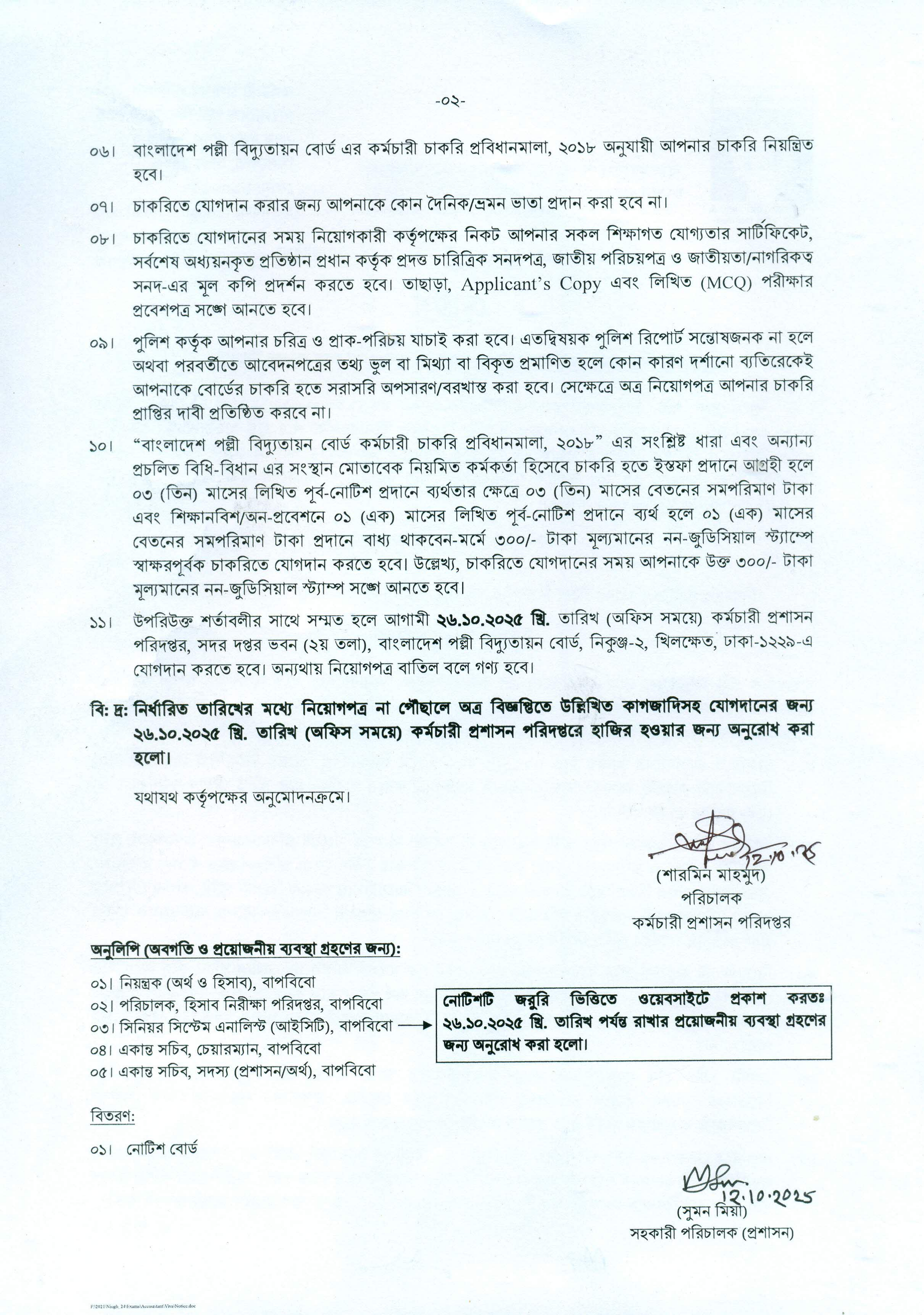 নির্বাচিত প্রার্থীদের ২৬.১০.২০২৫ খ্রি. তারিখের (অফিস সময়ে) মধ্যে কর্মচারী প্রশাসন পরিদপ্তর, সদর দপ্তর ভবন (২য় তলা), বাংলাদেশ পল্লী বিদ্যুতায়ন বোর্ড, নিকুঞ্জ-২, খিলক্ষেত, ঢাকা-১২২৯-এ যোগদান করতে হবে। নির্ধারিত তারিখের মধ্যে যোগদান না করলে নিয়োগপত্র বাতিল বলে গণ্য হবে।