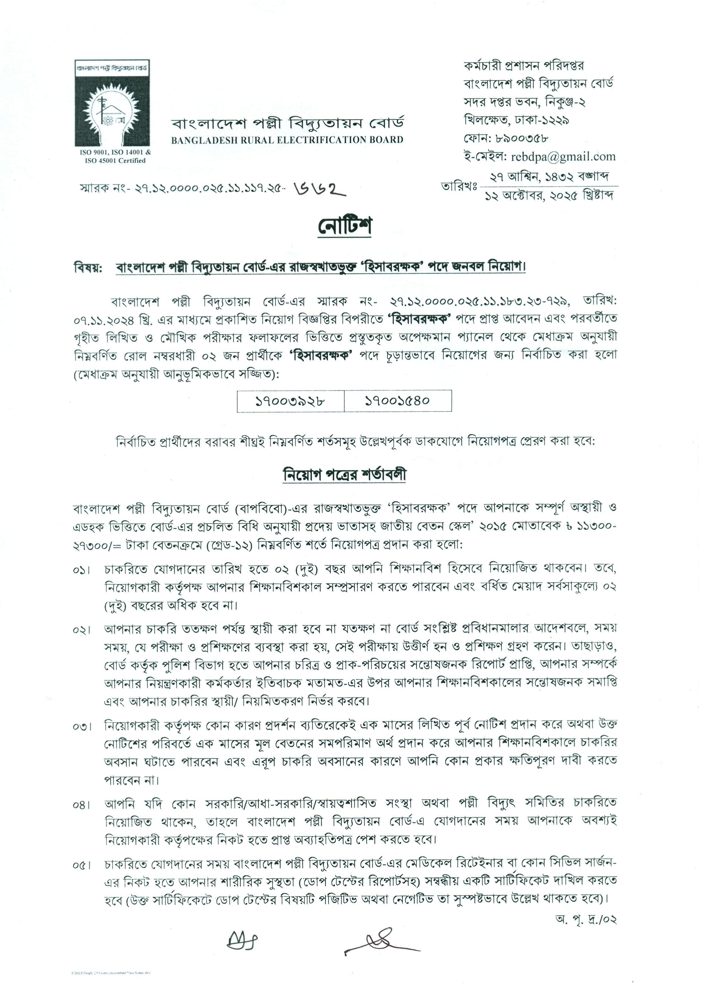 বাংলাদেশ পল্লী বিদ্যুতায়ন বোর্ড (বাপবিবো)-এর রাজস্বখাতভুক্ত "হিসাবরক্ষক" পদে ০২ (দুই) জন প্রার্থীকে চূড়ান্তভাবে নিয়োগের জন্য নির্বাচন করা হয়েছে। পূর্বের নিয়োগ বিজ্ঞপ্তির বিপরীতে প্রাপ্ত আবেদন এবং পরবর্তীতে গৃহীত লিখিত ও মৌখিক পরীক্ষার ফলাফলের ভিত্তিতে এই নির্বাচন করা হয়েছে।