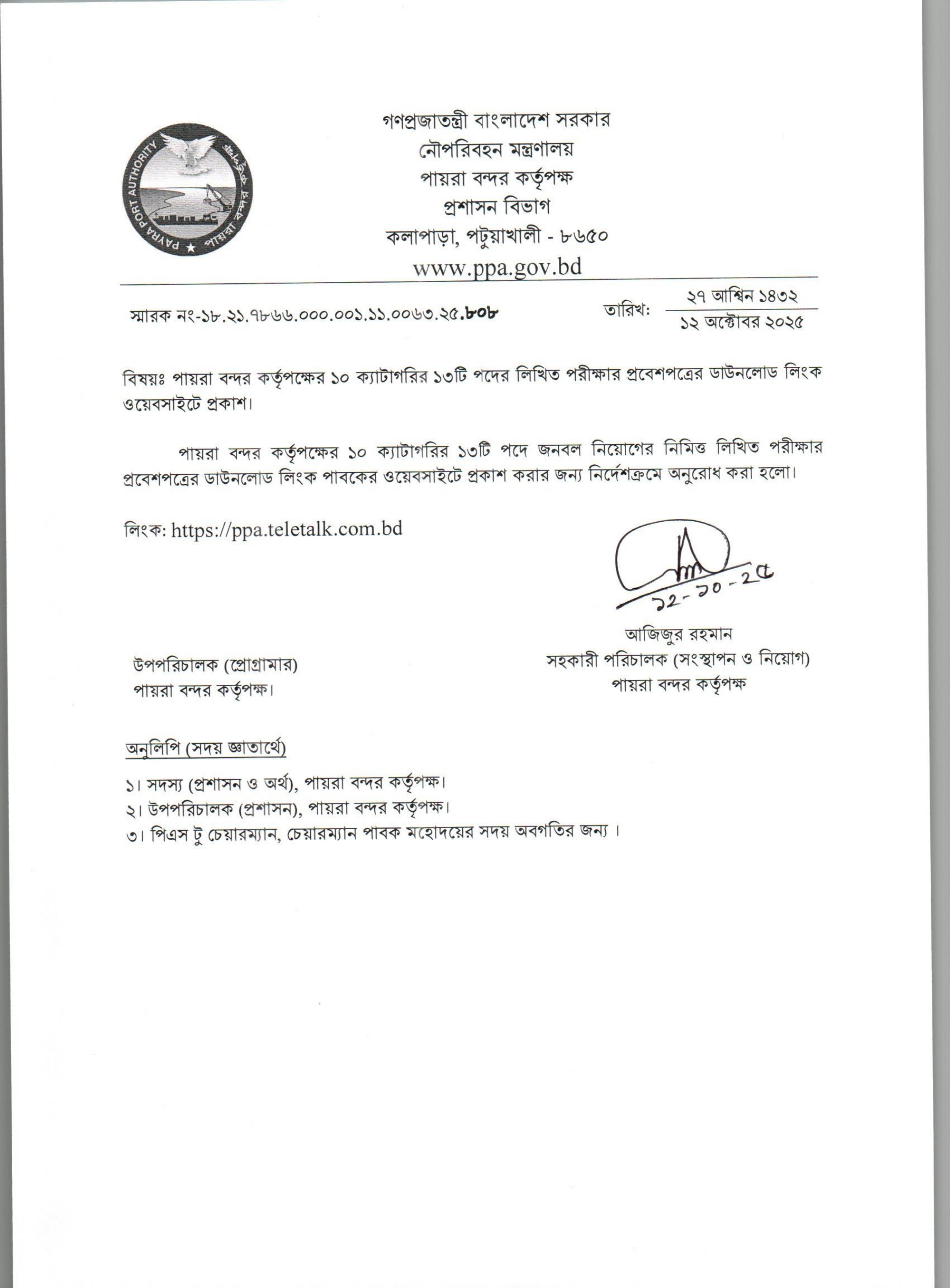 পায়রা বন্দর কর্তৃপক্ষের অধীনে ১০ ক্যাটাগরির ১৩টি পদের লিখিত পরীক্ষার প্রবেশপত্র ডাউনলোড লিংক কর্তৃপক্ষের ওয়েবসাইটে প্রকাশ করা হয়েছে।