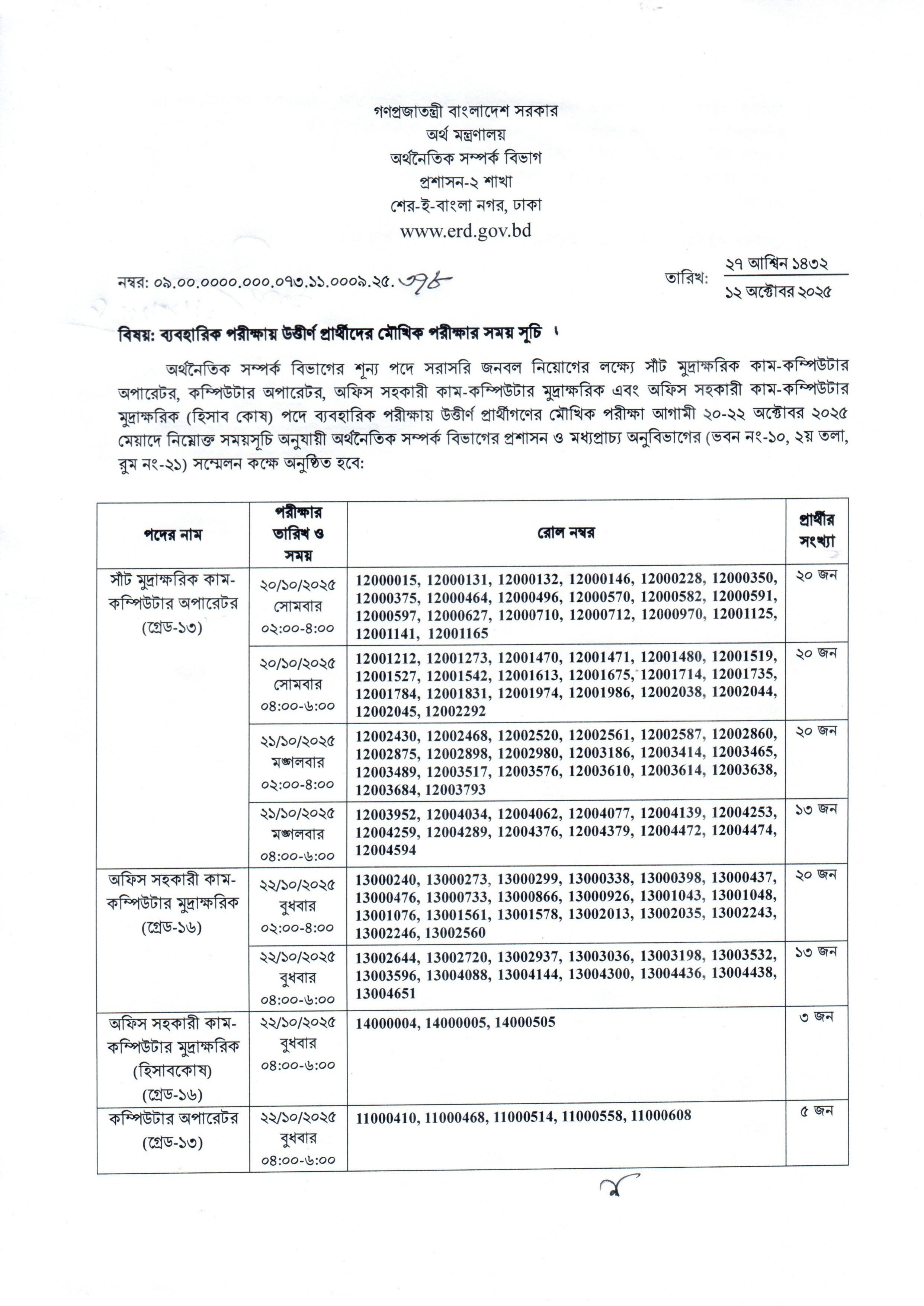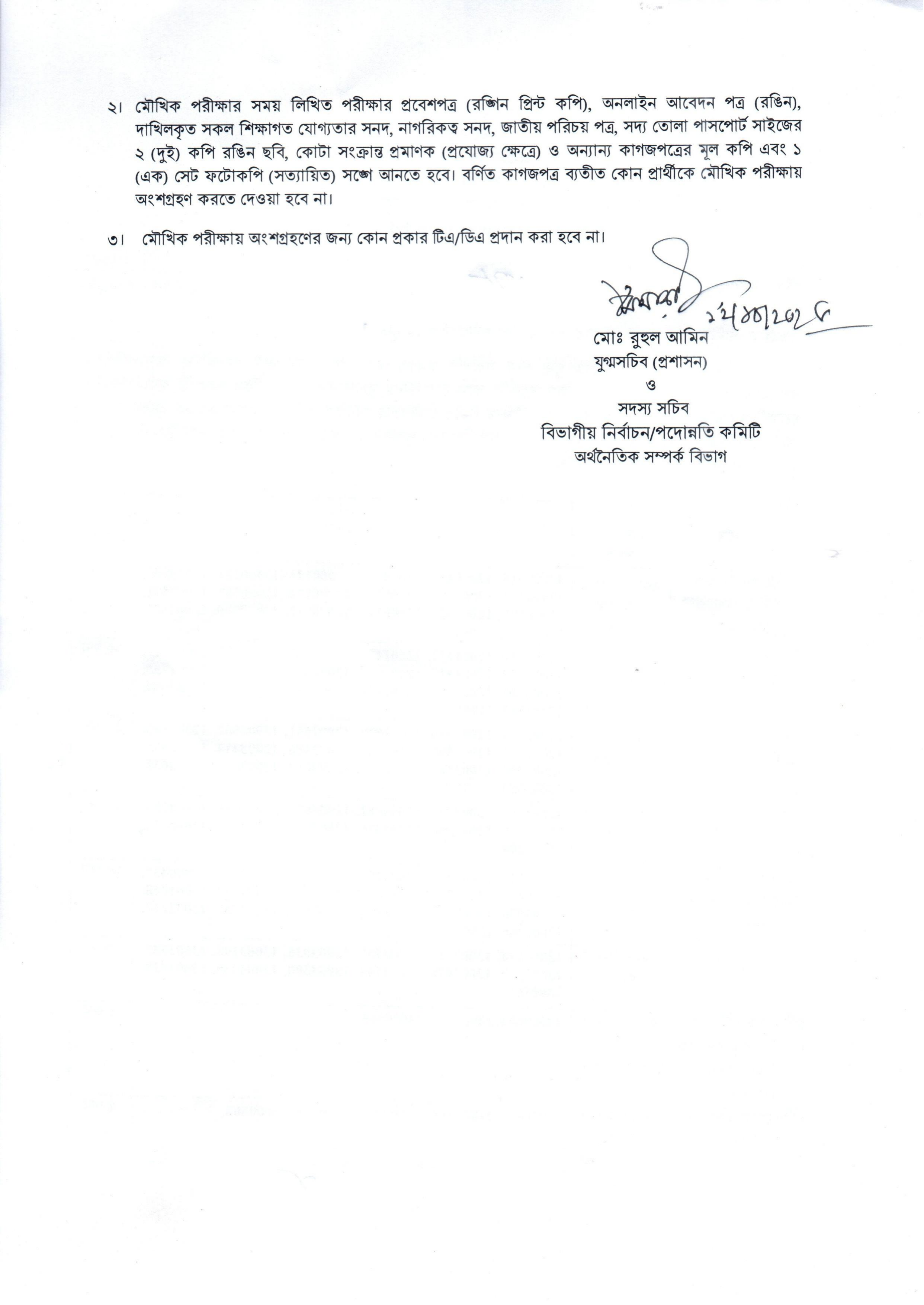 অর্থনৈতিক সম্পর্ক বিভাগ কর্তৃক সম্প্রতি প্রকাশিত হয়েছে ব্যবহারিক পরীক্ষায় উত্তীর্ণ প্রার্থীদের মৌখিক পরীক্ষার সময়সূচি।