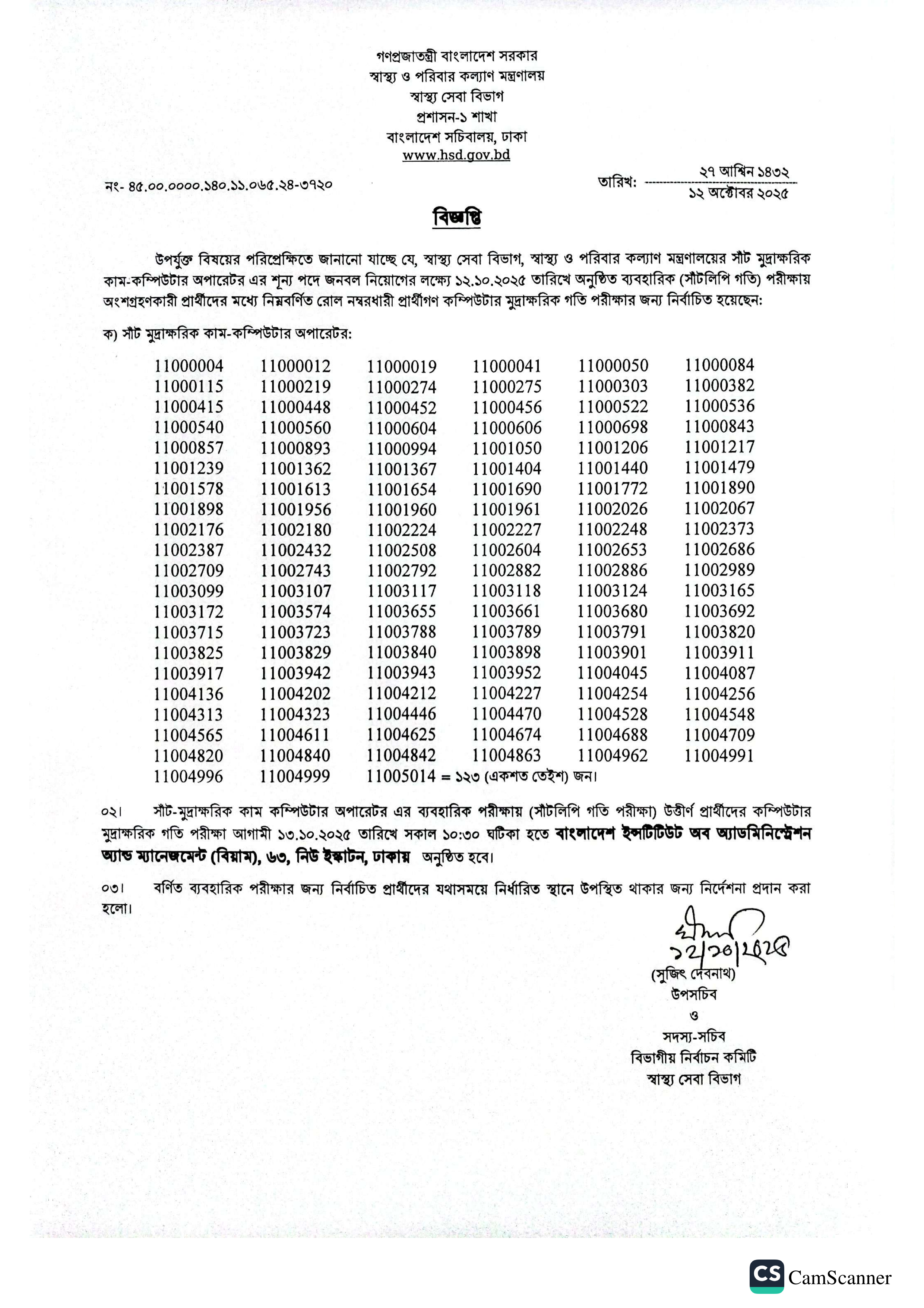 স্বাস্থ্য ও পরিবার কল্যাণ মন্ত্রণালয়ের স্বাস্থ্য সেবা বিভাগের সীট মুদ্রাক্ষরিক কাম-কম্পিউটার অপারেটর পদের নিয়োগের লক্ষ্যে অনুষ্ঠিত ব্যবহারিক (সাঁটলিপি গতি) পরীক্ষার ফলাফল প্রকাশিত হয়েছে। এই পরীক্ষায় মোট ১২৩ জন প্রার্থী কম্পিউটার মুদ্রাক্ষরিক গতি পরীক্ষার জন্য নির্বাচিত হয়েছেন।