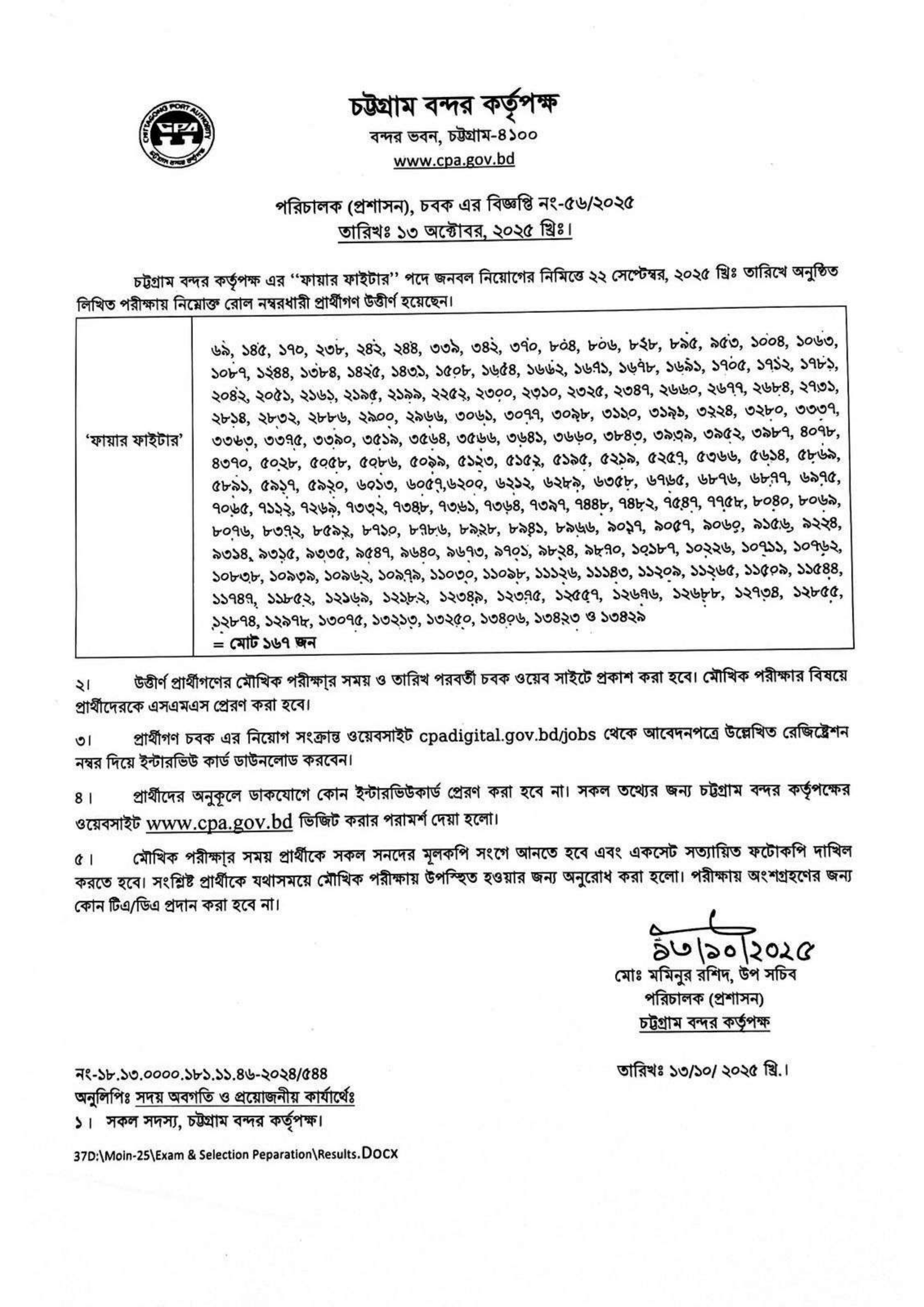 চট্টগ্রাম বন্দর কর্তৃপক্ষ এর “ফায়ার ফাইটার” পদে জনবল নিয়োগের নিমিত্তে গত ২২ সেপ্টেম্বর, ২০২৫ খ্রিঃ তারিখে অনুষ্ঠিত লিখিত পরীক্ষার ফলাফল প্রকাশিত হয়েছে।