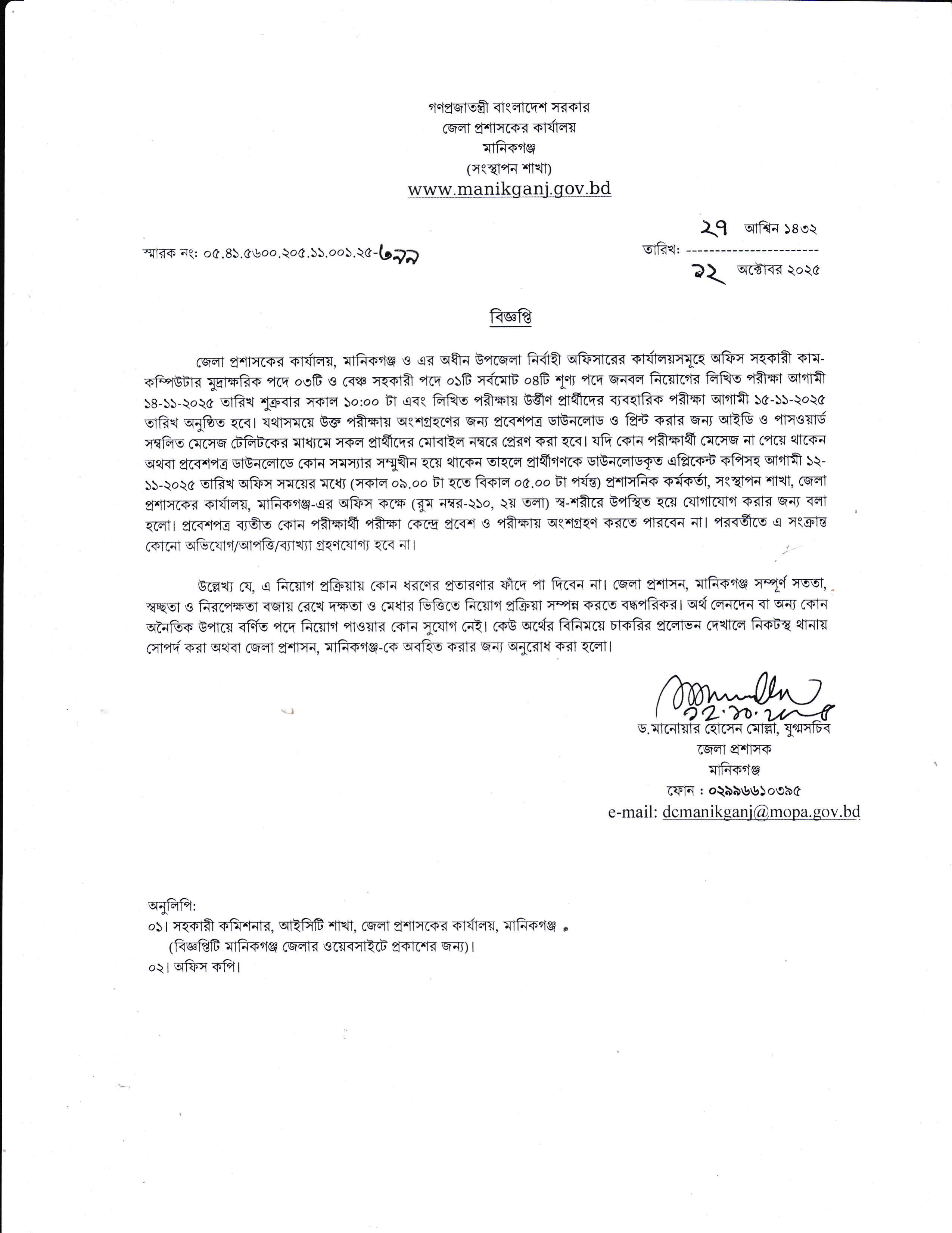 প্রবেশপত্র সংক্রান্ত সমস্যা: যদি কোনো পরীক্ষার্থী মেসেজ না পান বা প্রবেশপত্র ডাউনলোডে সমস্যার সম্মুখীন হন, তবে আগামী ১২-১১-২০২৫ তারিখ সকাল ০৯:০০ টা থেকে বিকাল ০৫:০০ টার মধ্যে প্রশাসনিক কর্মকর্তা, সংস্থাপন শাখা, জেলা প্রশাসকের কার্যালয়, মানিকগঞ্জ-এর অফিস কক্ষে (রুম নম্বর-২১০, ২য় তলা) ডাউনলোডকৃত এপ্লিকেন্ট কপিসহ স্ব-শরীরে উপস্থিত হয়ে যোগাযোগ করার জন্য বলা হয়েছে।