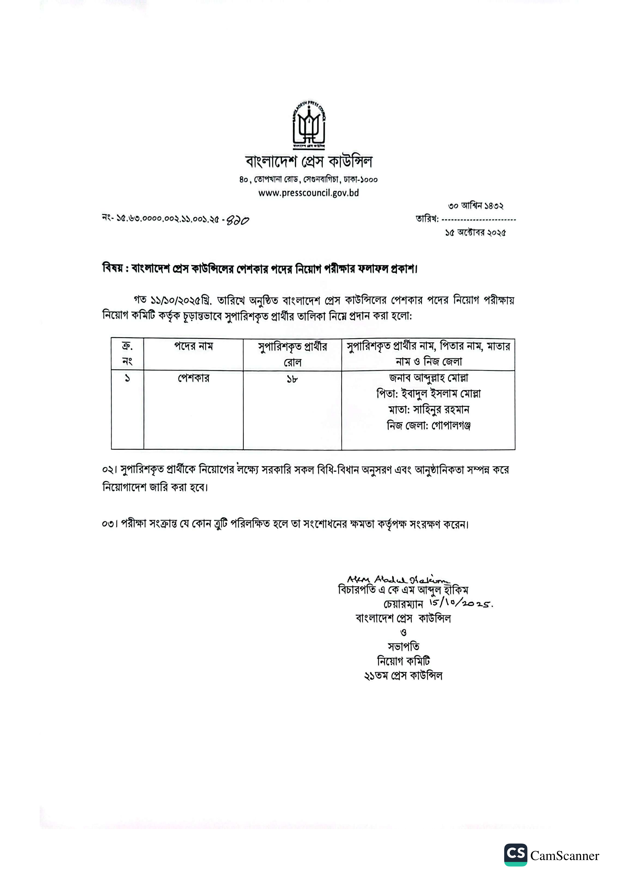 বাংলাদেশ প্রেস কাউন্সিল কর্তৃক গত ১১ অক্টোবর ২০২৫ তারিখে অনুষ্ঠিত পেশকার পদের নিয়োগ পরীক্ষার চূড়ান্ত ফলাফল প্রকাশিত হয়েছে।