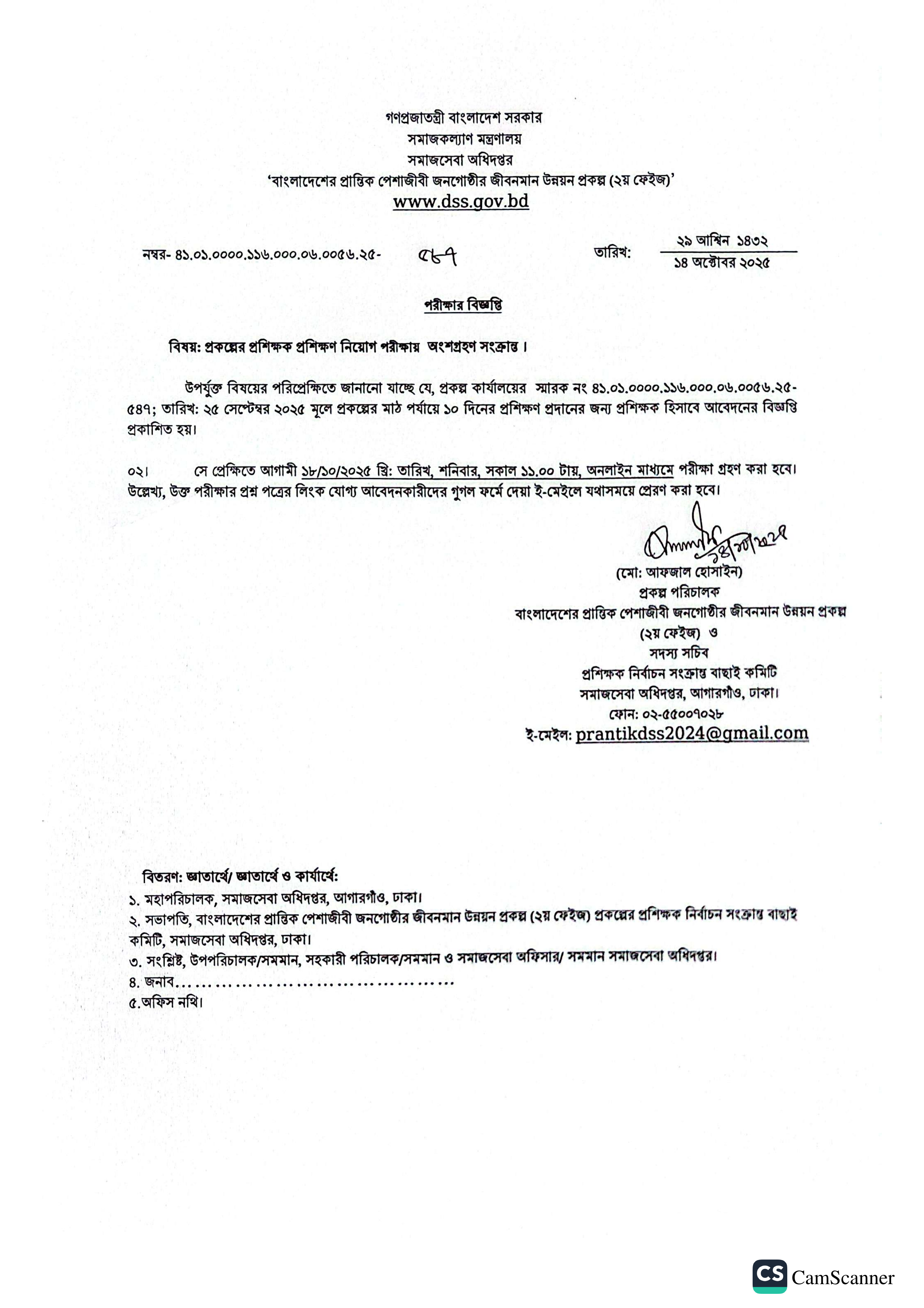সমাজকল্যাণ মন্ত্রণালয়ের অধীন সমাজসেবা অধিদপ্তর কর্তৃক বাস্তবায়িত “বাংলাদেশের প্রান্তিক পেশাজীবী জনগোষ্ঠীর জীবনমান উন্নয়ন প্রকল্প (২য় ফেইজ)” এর আওতায় প্রশিক্ষক পদে নিয়োগ পরীক্ষার তারিখ ঘোষণা করা হয়েছে।