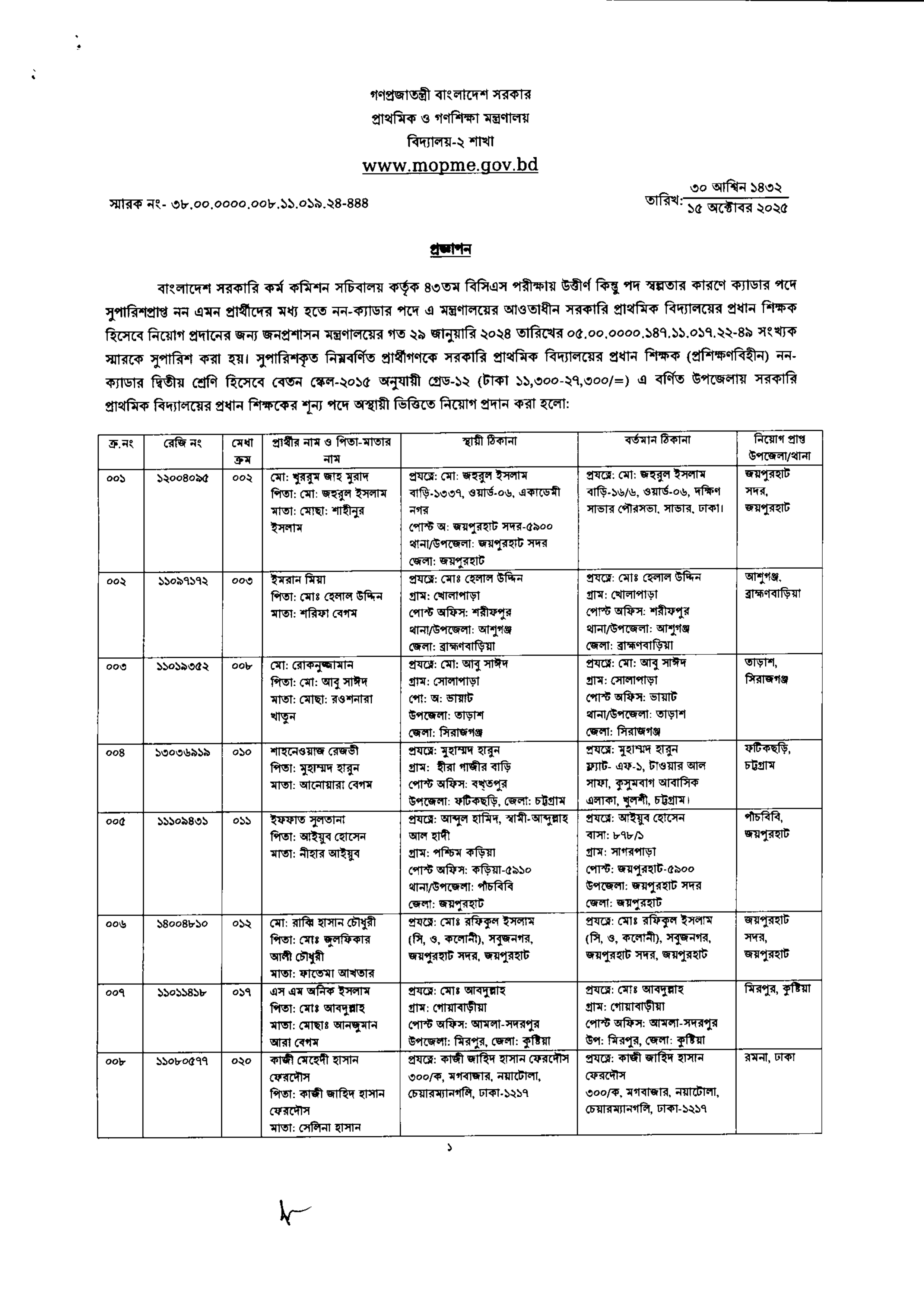 প্রাথমিক ও গণশিক্ষা মন্ত্রণালয়ের আওতাধীন সরকারি প্রাথমিক বিদ্যালয়ে ৮৭৬ জন প্রধান শিক্ষক (প্রশিক্ষণবিহীন, নন-ক্যাডার দ্বিতীয় শ্রেণি) পদে নিয়োগ প্রদান করা হয়েছে। বাংলাদেশ সরকারি কর্ম কমিশন সচিবালয় কর্তৃক ৪৩তম বিসিএস পরীক্ষায় উত্তীর্ণ কিন্তু পদ স্বল্পতার কারণে ক্যাডার পদে সুপারিশপ্রাপ্ত নন এমন প্রার্থীদের মধ্য থেকে এই নিয়োগ দেওয়া হয়েছে।