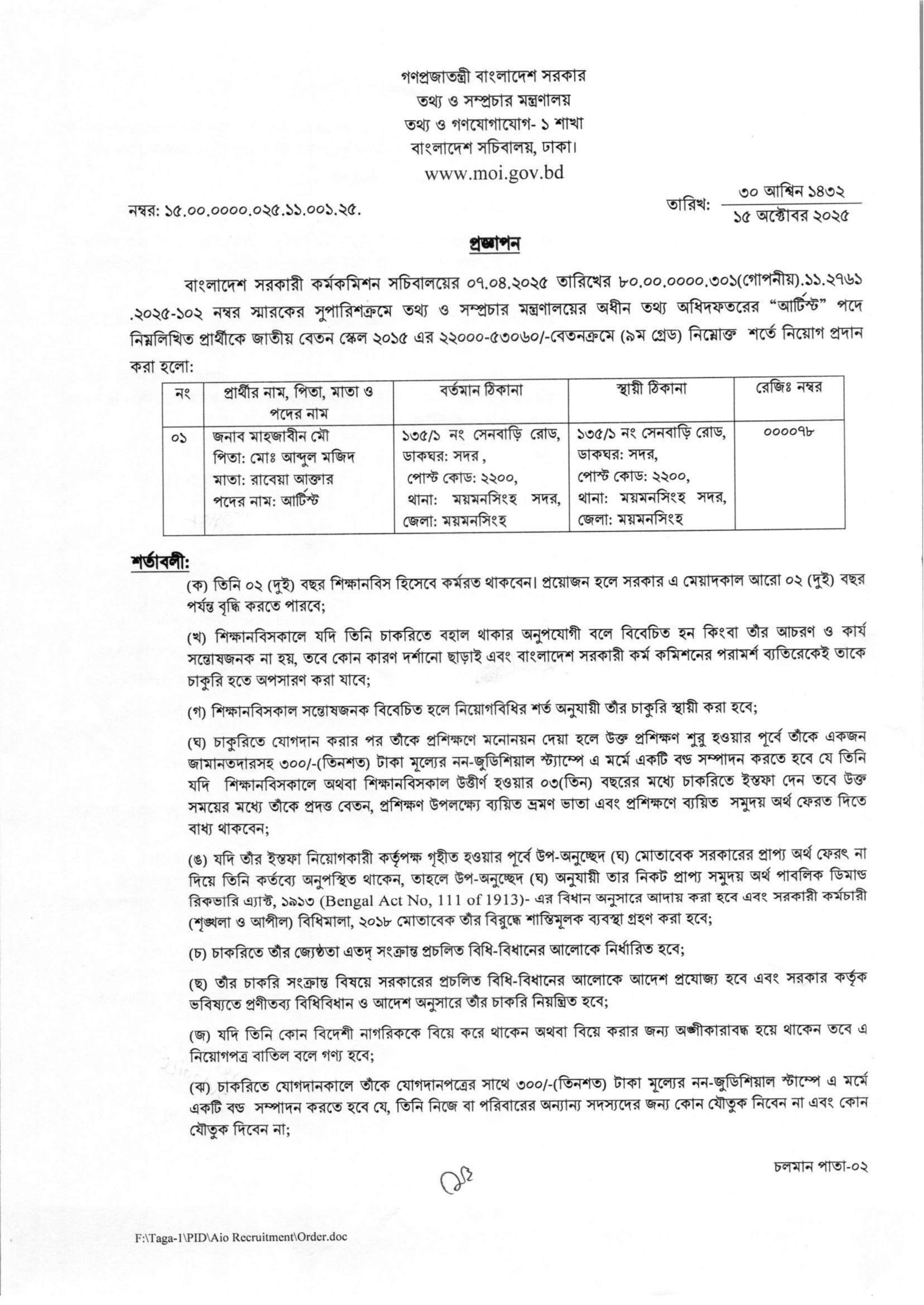 তথ্য ও সম্প্রচার মন্ত্রণালয়ের অধীন তথ্য অধিদফতরের আট্টিস্ট পদে একজন প্রার্থীকে জাতীয় বেতন স্কেল ২০১৫ এর ২২০০০-৫৩০৬০/- বেতনক্রমে (৯ম গ্রেড) নিয়োগ প্রদান করা হয়েছে।