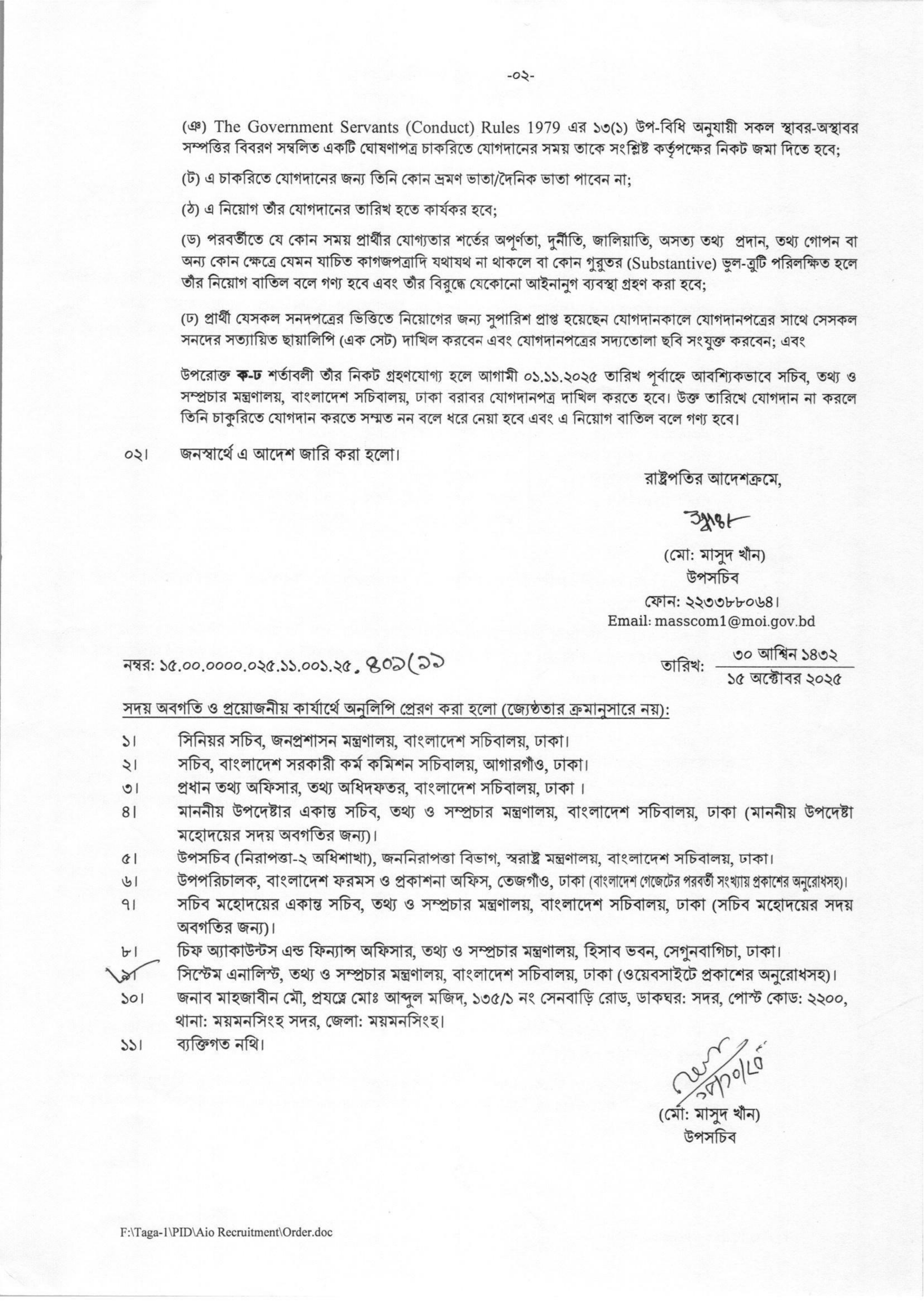 নিয়োগপ্রাপ্ত প্রার্থীকে ০২ (দুই) বছর শিক্ষানবিস হিসেবে কর্মরত থাকতে হবে। তাঁকে আগামী ০১.১১.২০২৫ তারিখ পূর্বাহ্নের মধ্যে সচিব, তথ্য ও সম্প্রচার মন্ত্রণালয়, বাংলাদেশ সচিবালয়, ঢাকা বরাবর যোগদানপত্র দাখিল করতে হবে। উক্ত তারিখে যোগদান না করলে নিয়োগ বাতিল বলে গণ্য হবে।