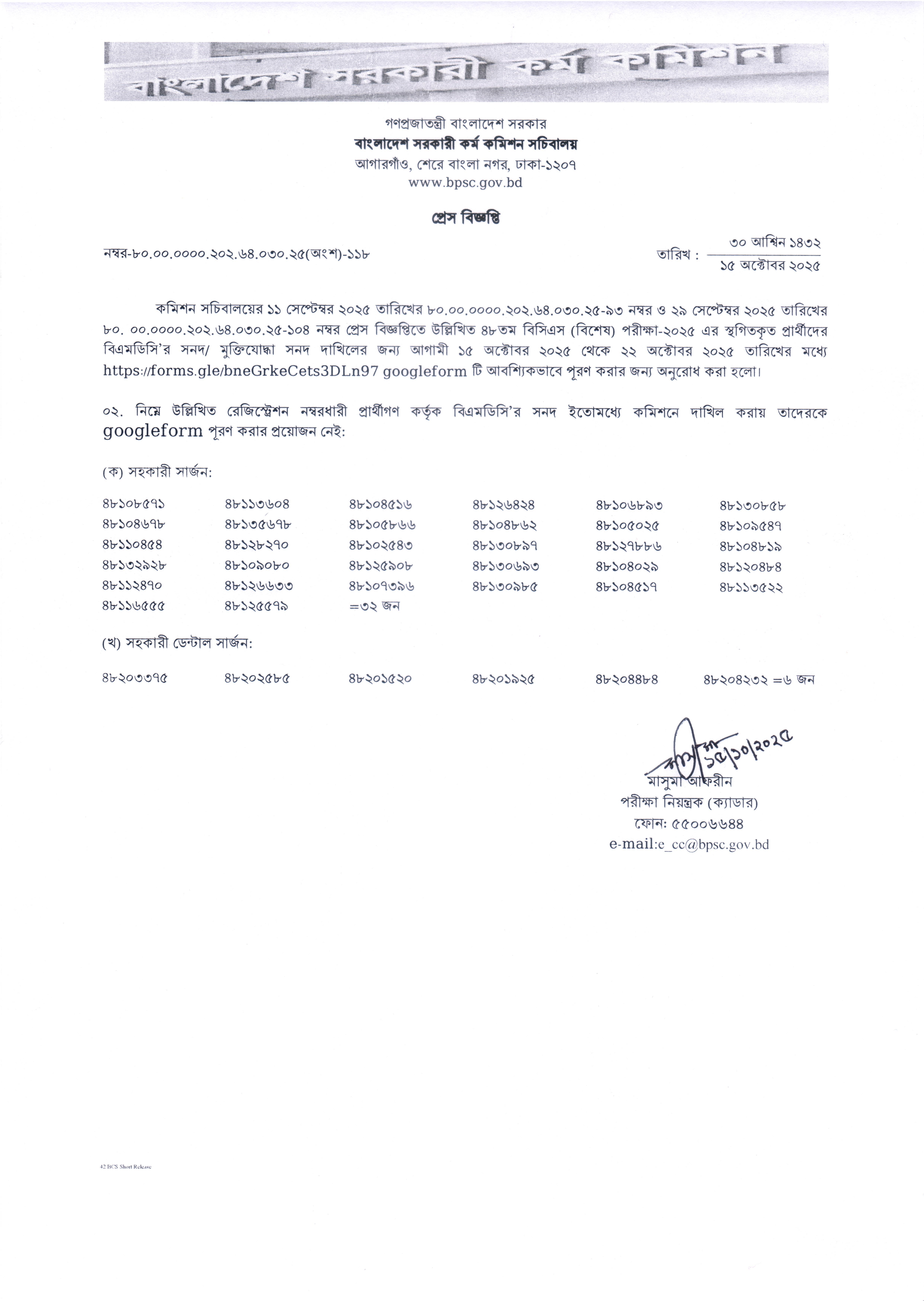 বিজ্ঞপ্তি অনুযায়ী, যেসব প্রার্থী পূর্বে স্থগিত হয়েছিলেন, তাদের বিএমডিসি'র সনদ অথবা মুক্তিযোদ্ধা সনদ আগামী ১৫ অক্টোবর ২০২৫ থেকে ২২ অক্টোবর ২০২৫ তারিখের মধ্যে নির্ধারিত অনলাইন ফর্মে আবশ্যিকভাবে পূরণ করে দাখিল করতে হবে।