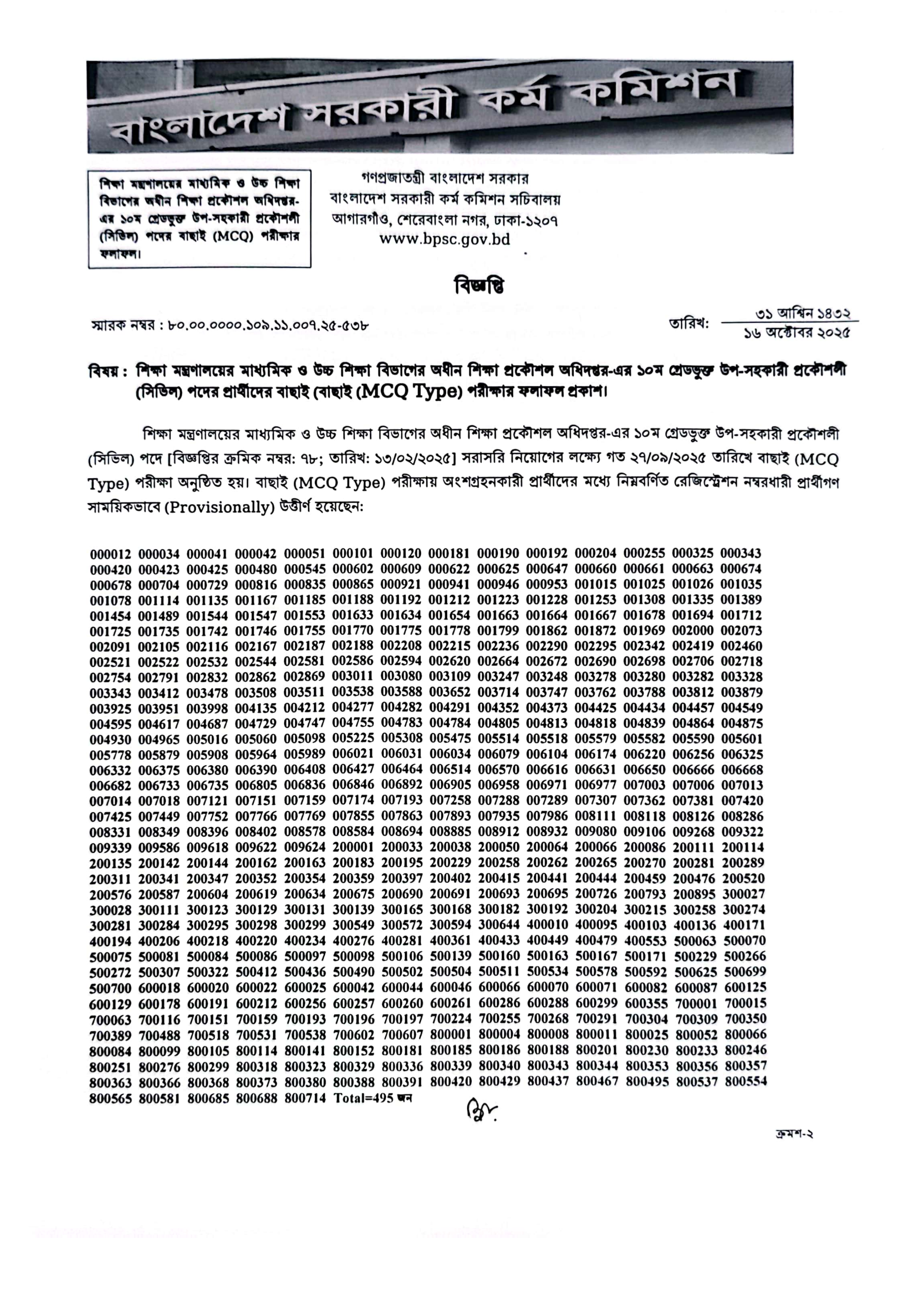গত ২৭/০৯/২০২৫ তারিখে এই বাছাই পরীক্ষা অনুষ্ঠিত হয়েছিল। এতে সাময়িকভাবে উত্তীর্ণ প্রার্থীদের রেজিস্ট্রেশন নম্বর প্রকাশ করা হয়েছে।