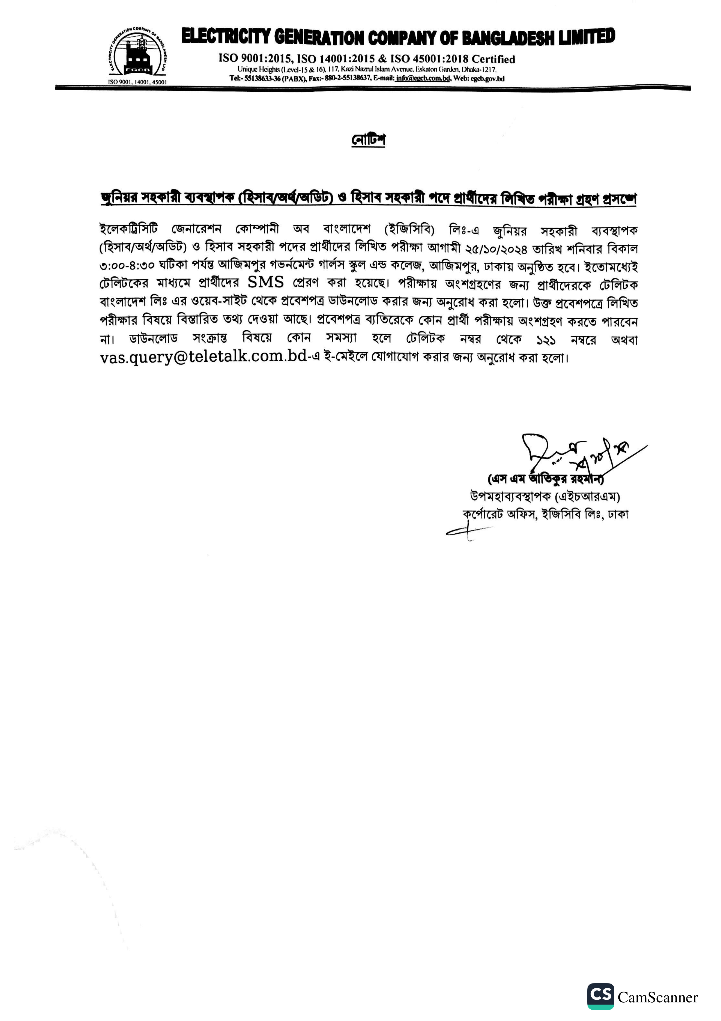 ইলেকট্রিসিটি জেনারেশন কোম্পানী অব বাংলাদেশ (ইজিসিবি) লিঃ-এর জুনিয়র সহকারী ব্যবস্থাপক (হিসাব/অর্থ/অডিট) এবং হিসাব সহকারী পদের লিখিত পরীক্ষার তারিখ, সময় ও স্থান সংক্রান্ত বিজ্ঞপ্তি প্রকাশিত হয়েছে।