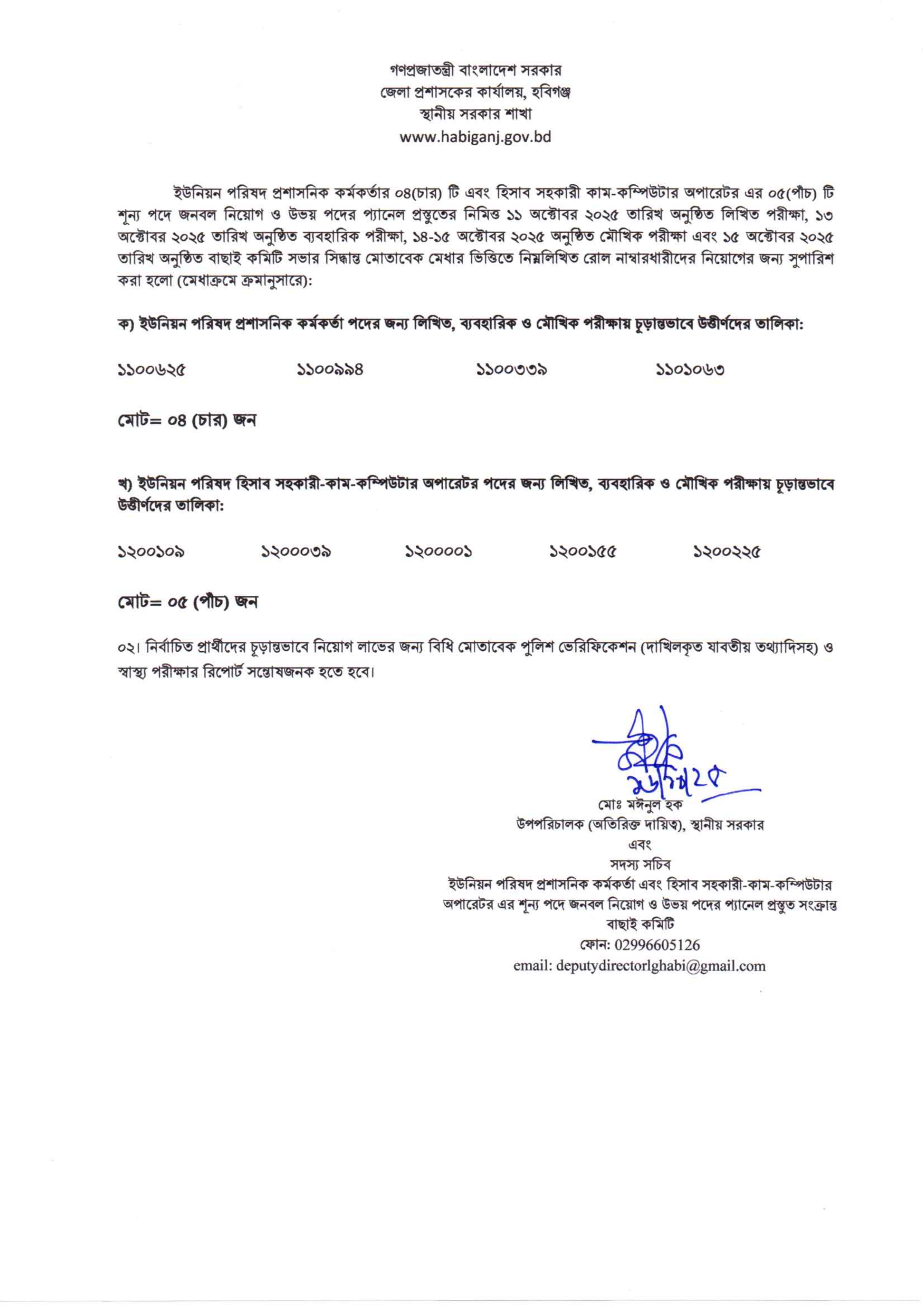 হবিগঞ্জ জেলা প্রশাসকের কার্যালয়ের অধীনে ইউনিয়ন পরিষদ প্রশাসনিক কর্মকর্তা এবং হিসাব সহকারী কাম-কম্পিউটার অপারেটর পদে জনবল নিয়োগের লক্ষ্যে অনুষ্ঠিত লিখিত, ব্যবহারিক ও মৌখিক পরীক্ষার চূড়ান্ত ফলাফল প্রকাশিত হয়েছে।