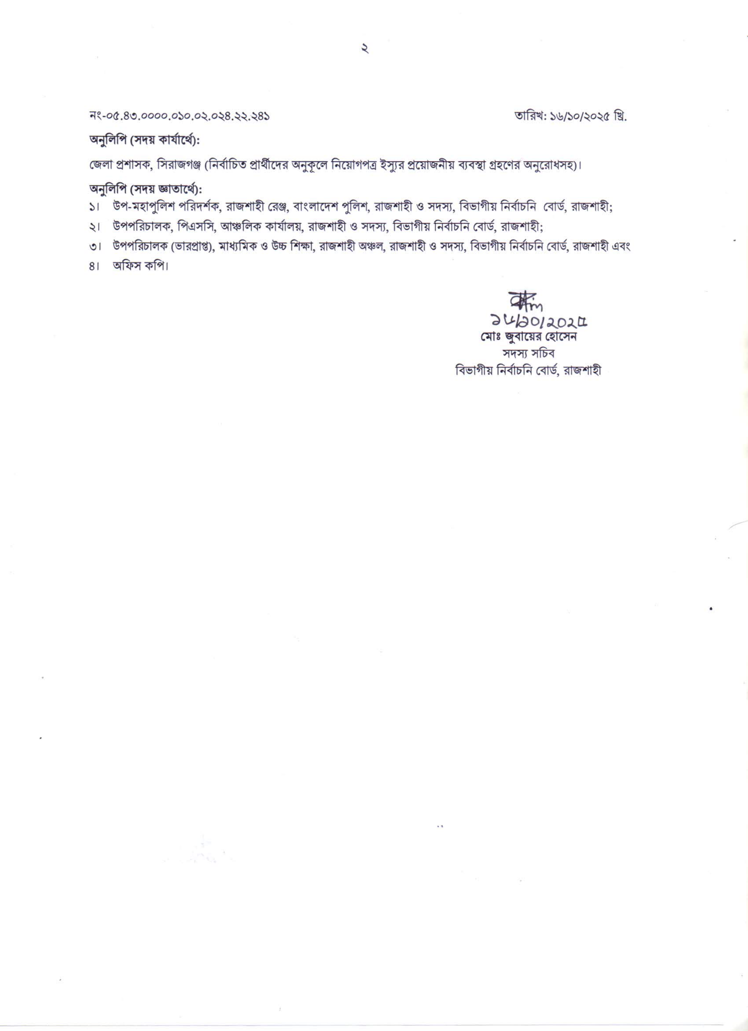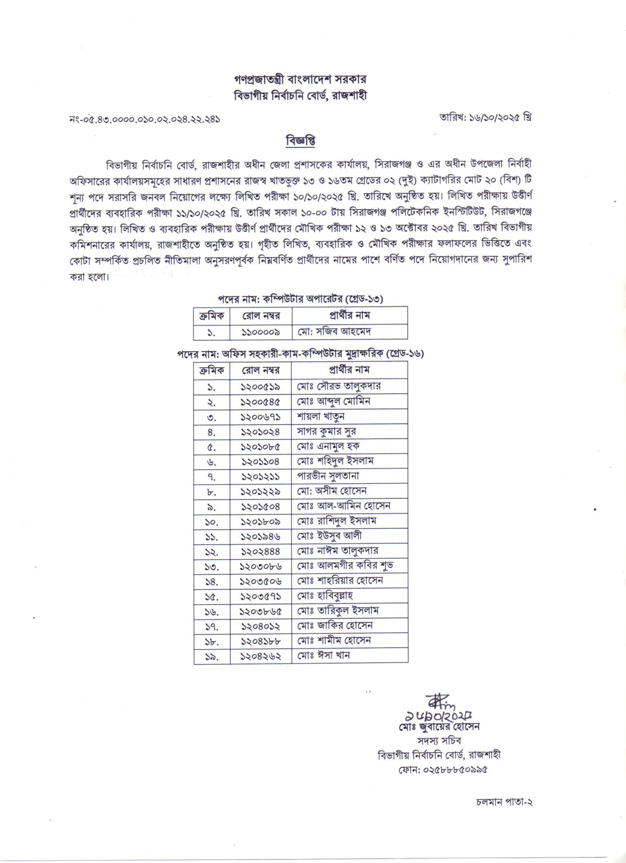বিভাগীয় নির্বাচনি বোর্ড, রাজশাহী এর অধীনে জেলা প্রশাসকের কার্যালয়, সিরাজগঞ্জ ও এর অধীন উপজেলা নির্বাহী অফিসারের কার্যালয়সমূহের সাধারণ প্রশাসনের রাজস্ব খাতভুক্ত ১৩ ও ১৬তম গ্রেডের মোট ২০টি শূন্য পদে সরাসরি জনবল নিয়োগের ফলাফলের ভিত্তিতে সুপারিশপত্র প্রকাশ করা হয়েছে।