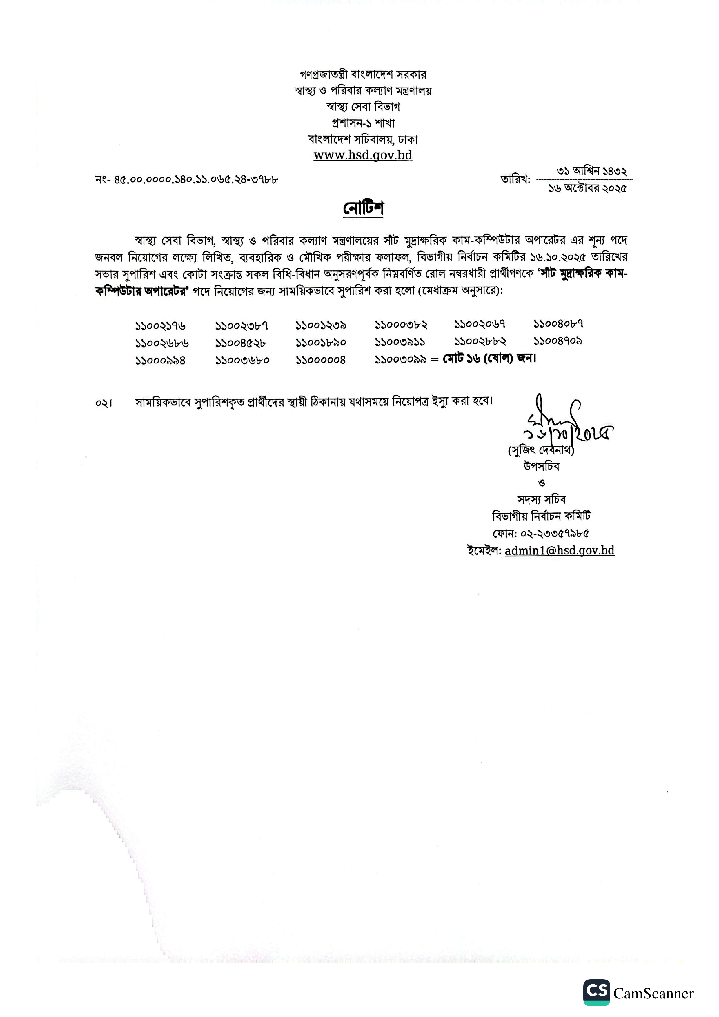বিভাগীয় নির্বাচন কমিটির ১৬.১০.২০২৫ তারিখের সভার সুপারিশ এবং কোটা সংক্রান্ত সকল বিধি-বিধান অনুসরণ করে মোট ১৬ (ষোল) জন প্রার্থীকে উক্ত পদের জন্য সাময়িকভাবে নিয়োগের সুপারিশ করা হয়েছে।