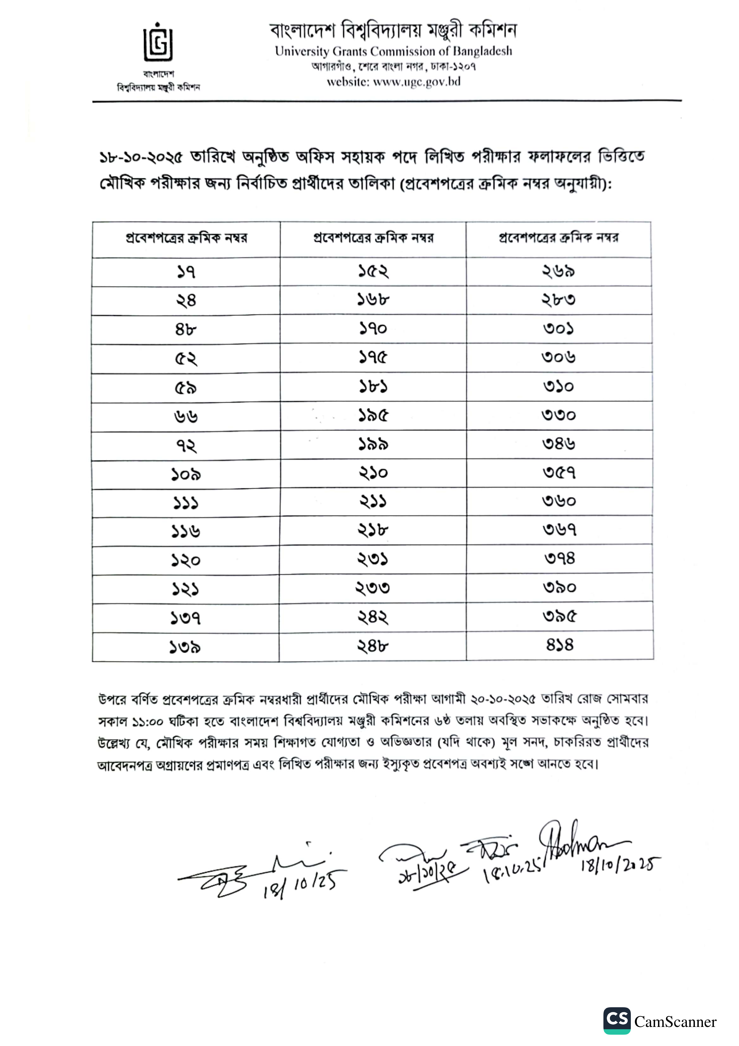 বাংলাদেশ বিশ্ববিদ্যালয় মঞ্জুরী কমিশন কর্তৃক অফিস সহায়ক পদে লিখিত পরীক্ষার ফলাফলের ভিত্তিতে মৌখিক পরীক্ষার জন্য নির্বাচিত প্রার্থীদের তালিকা প্রকাশ করা হয়েছে। নির্বাচিত প্রার্থীদের প্রবেশপত্রের ক্রমিক নম্বর বিজ্ঞপ্তিতে দেওয়া আছে।