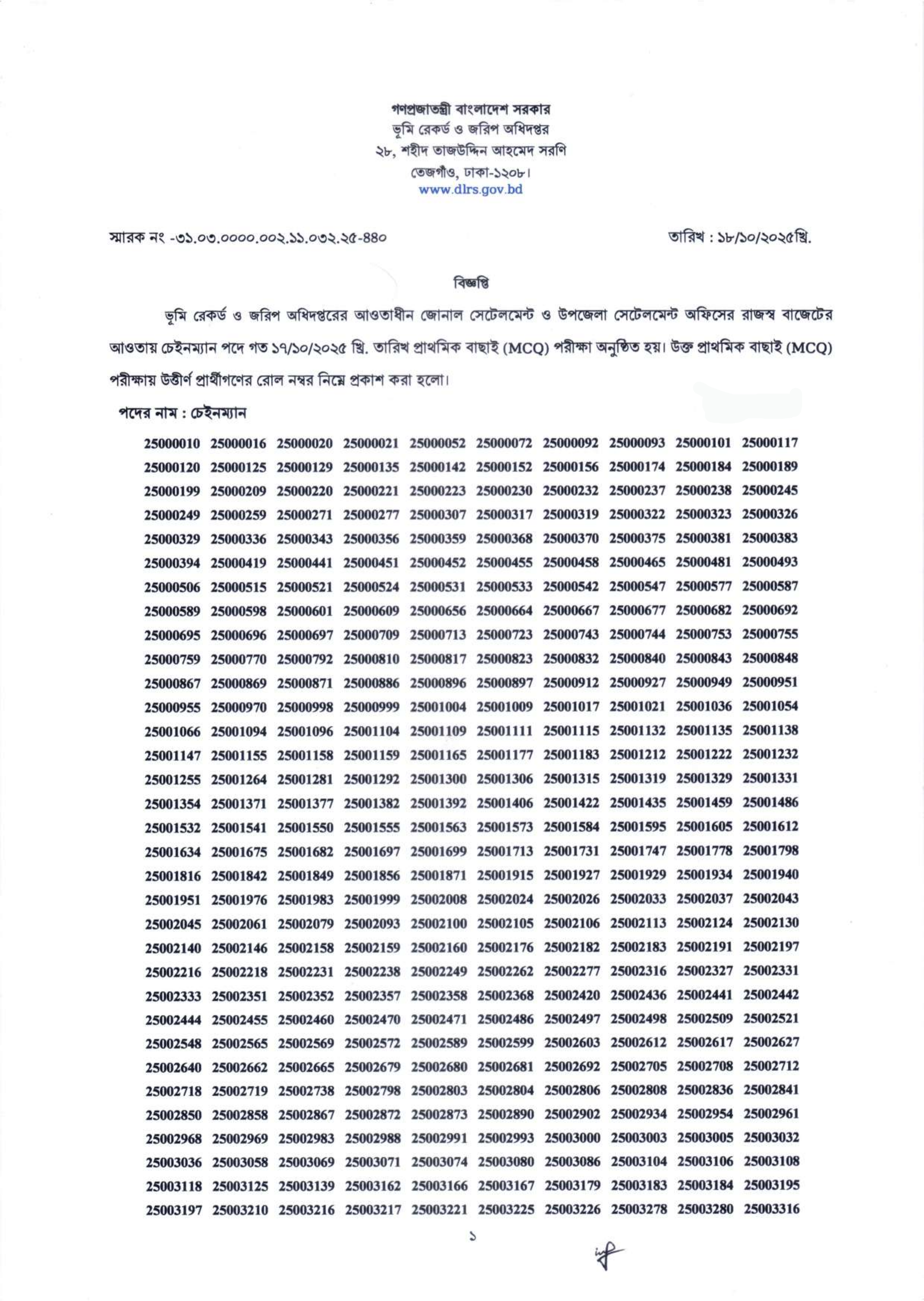 ভূমি রেকর্ড ও জরিপ অধিদপ্তরের আওতাধীন জোনাল সেটেলমেন্ট ও উপজেলা সেটেলমেন্ট অফিসের রাজস্ব বাজেটের আওতায় চেইনম্যান পদে গত ১৭/১০/২০২৫ খ্রি. তারিখে অনুষ্ঠিত প্রাথমিক বাছাই (লিখিত) পরীক্ষার ফলাফল প্রকাশিত হয়েছে।