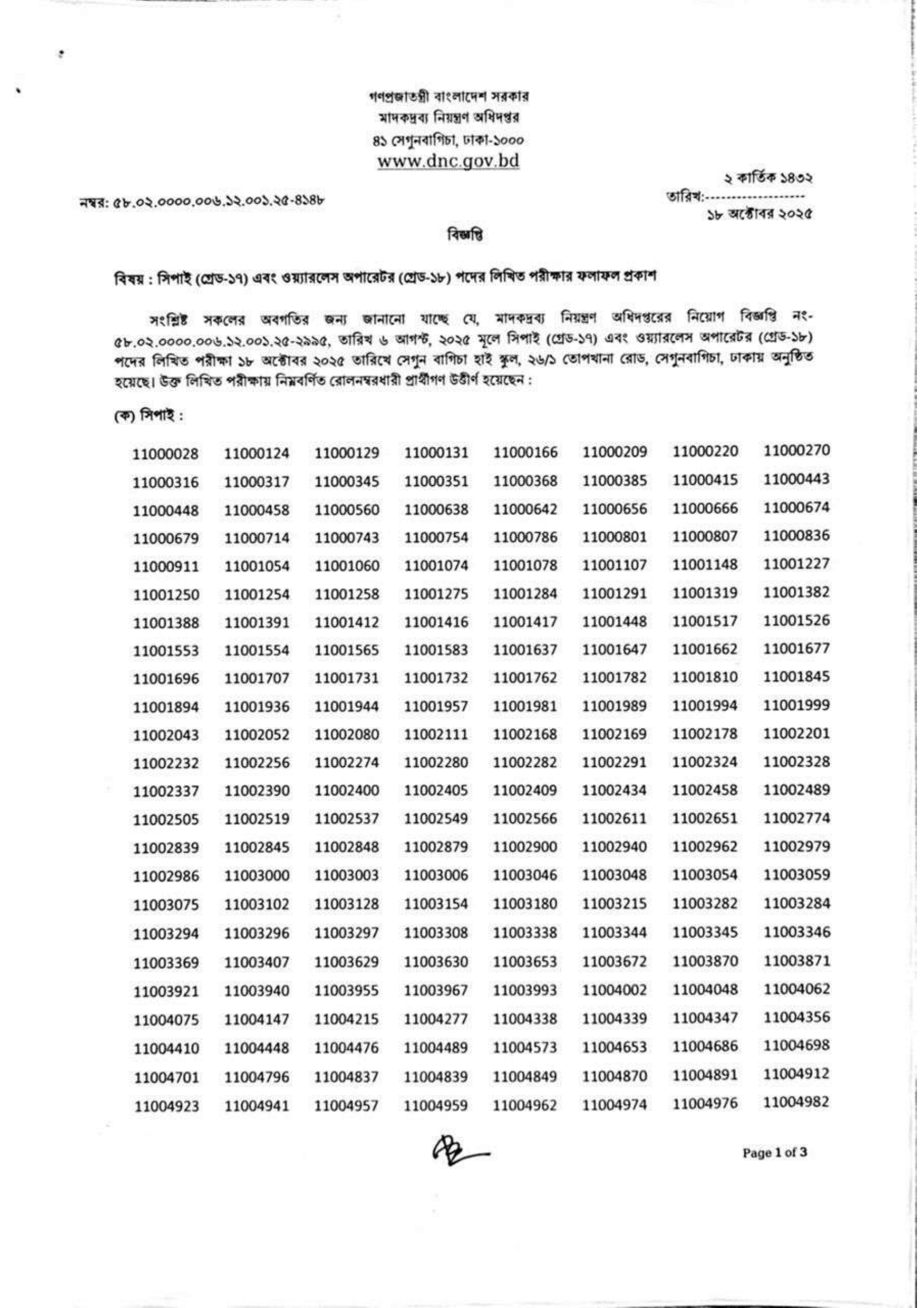 মাদকদ্রব্য নিয়ন্ত্রণ অধিদপ্তরের সিপাই (গ্রেড-১৭) এবং ওয়্যারলেস অপারেটর (গ্রেড-১৮) পদের লিখিত পরীক্ষার ফলাফল প্রকাশ করা হয়েছে।