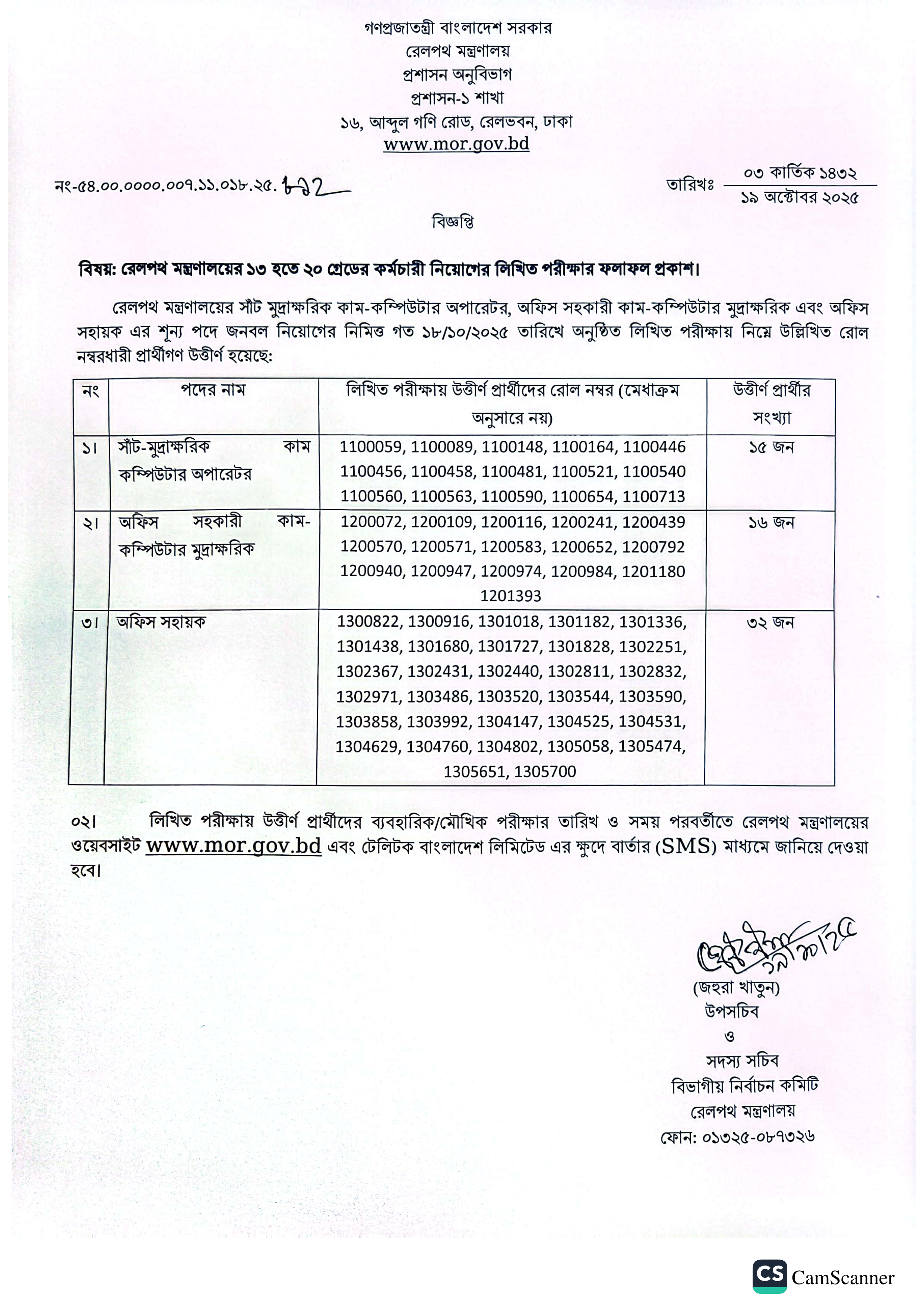 গত ১৮/১০/২০২৫ তারিখে অনুষ্ঠিত এই পরীক্ষায় সাঁট মুদ্রাক্ষরিক কাম-কম্পিউটার অপারেটর, অফিস সহকারী কাম-কম্পিউটার মুদ্রাক্ষরিক এবং অফিস সহায়ক পদের জন্য যারা অংশগ্রহণ করেছিলেন, তাদের মধ্য থেকে নির্ধারিত সংখ্যক প্রার্থী উত্তীর্ণ হয়েছেন।