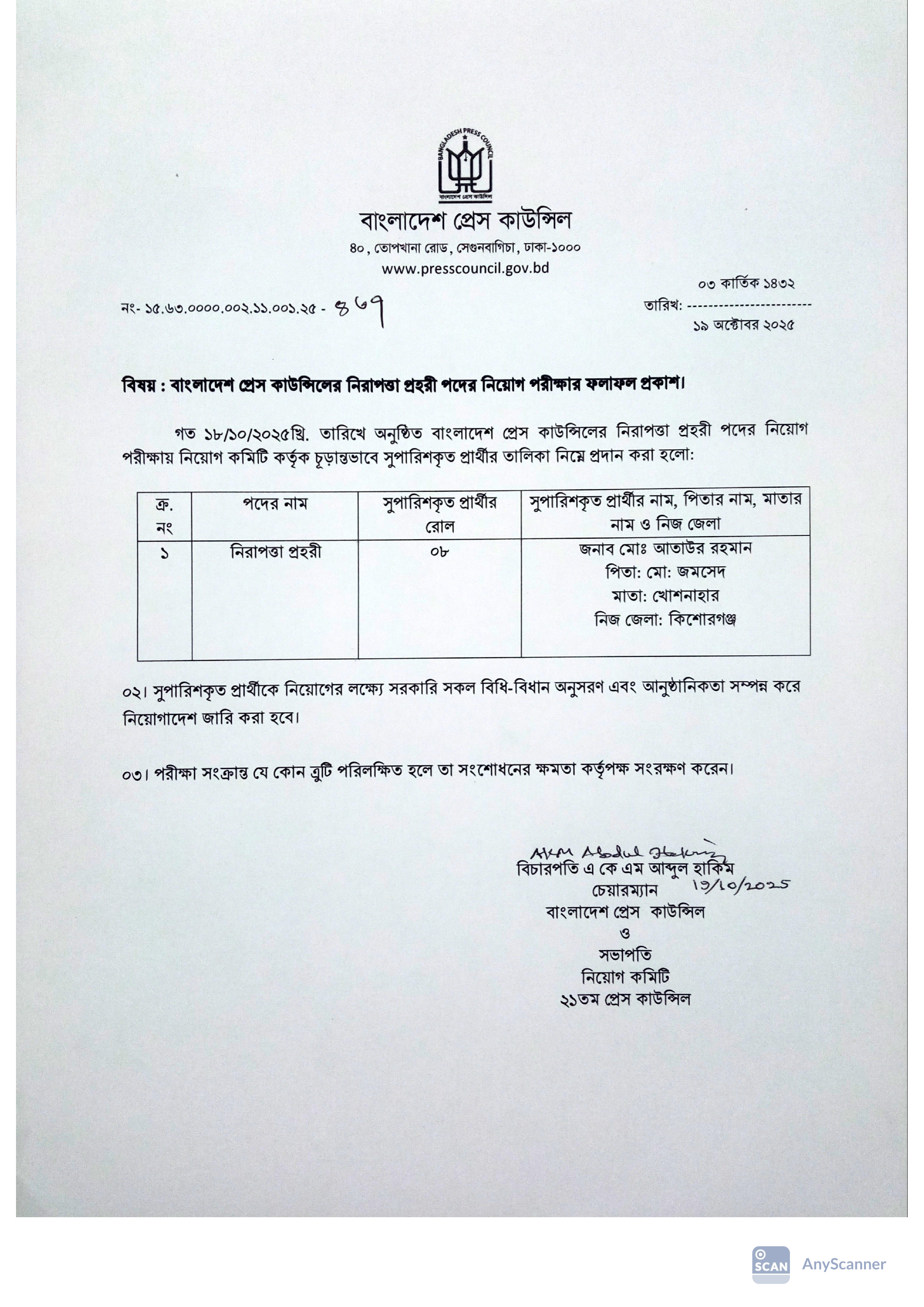 গত ১৮/১০/২০২৫ তারিখে অনুষ্ঠিত এই নিয়োগ পরীক্ষায় নিয়োগ কমিটি কর্তৃক চূড়ান্তভাবে সুপারিশকৃত প্রার্থীর তালিকা প্রকাশ করা হয়েছে।