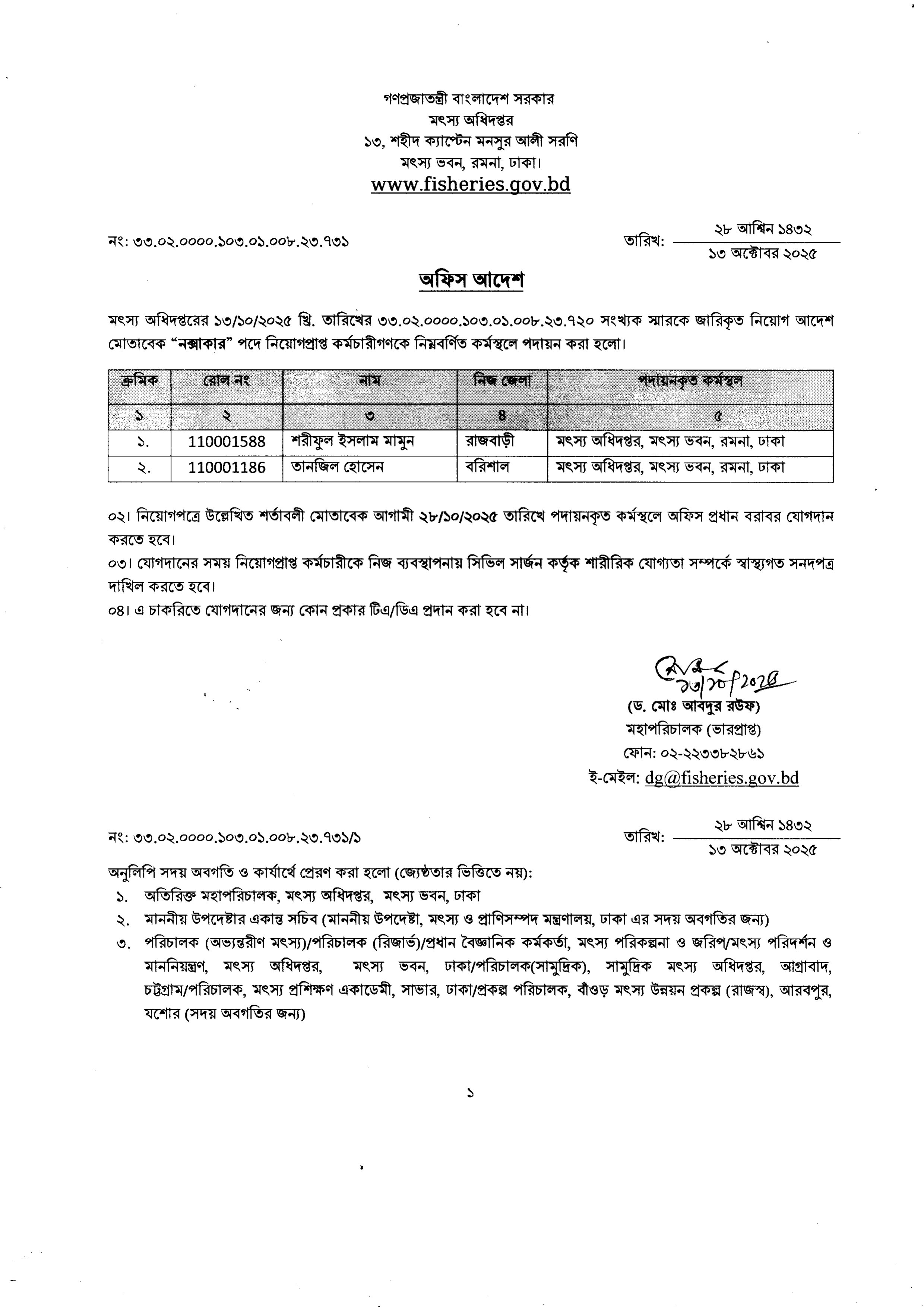 নিয়োগপ্রাপ্ত কর্মচারীদের ২৮/১০/২০২৫ তারিখের মধ্যে পদায়নকৃত কর্মস্থলে সংশ্লিষ্ট অফিস প্রধান বরাবর যোগদান করতে হবে।