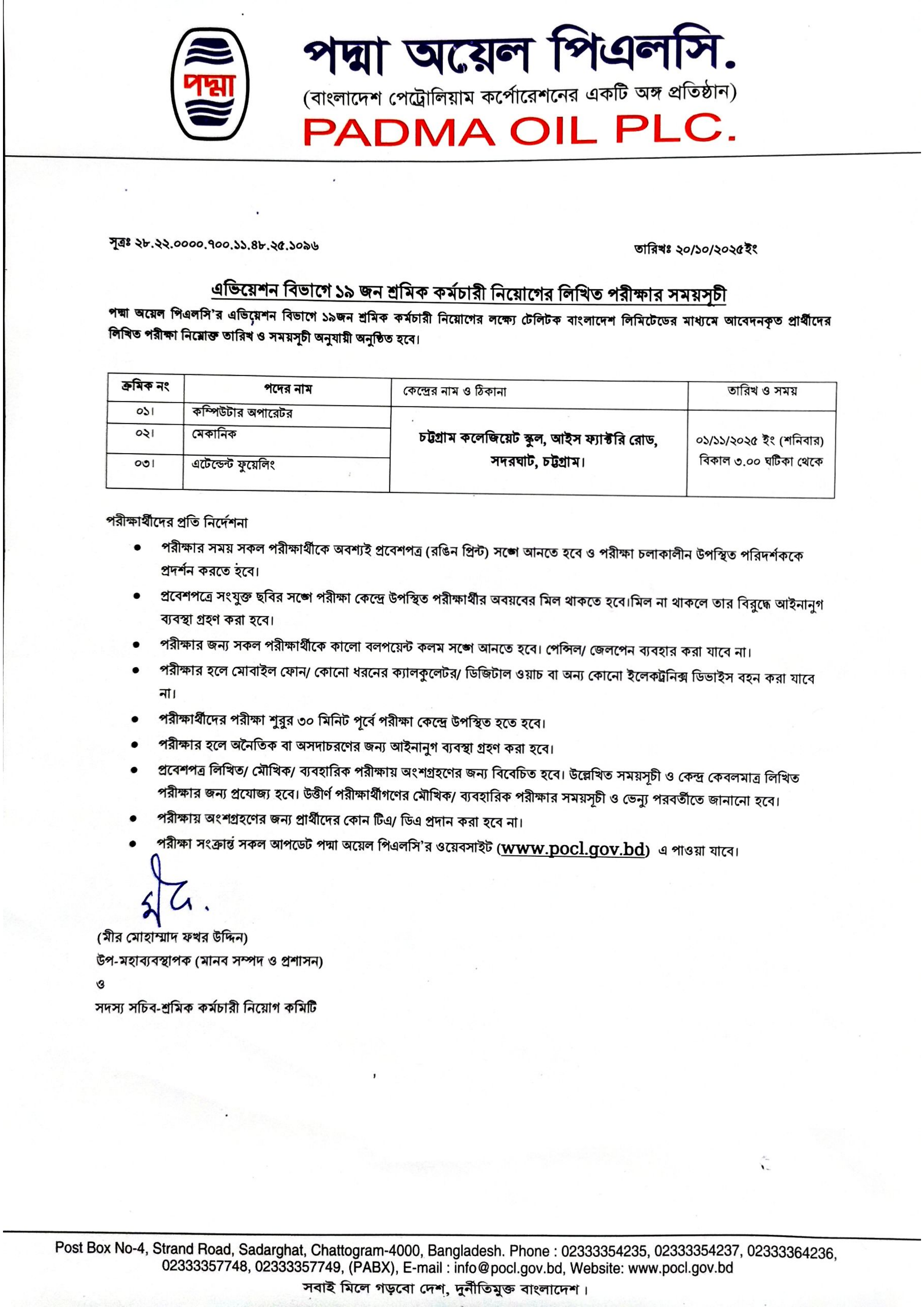 লিখিত পরীক্ষায় উত্তীর্ণ পরীক্ষার্থীগণের মৌখিক বা ব্যবহারিক পরীক্ষার সময়সূচী ও ভেন্যু পরবর্তীতে জানানো হবে। পরীক্ষায় অংশগ্রহণের জন্য প্রার্থীদের কোনো টিএ/ডিএ প্রদান করা হবে না। পরীক্ষা সংক্রান্ত সকল আপডেট পদ্মা অয়েল পিএলসি'র ওয়েবসাইট (www.padmaoil.com.bd) এ পাওয়া যাবে।