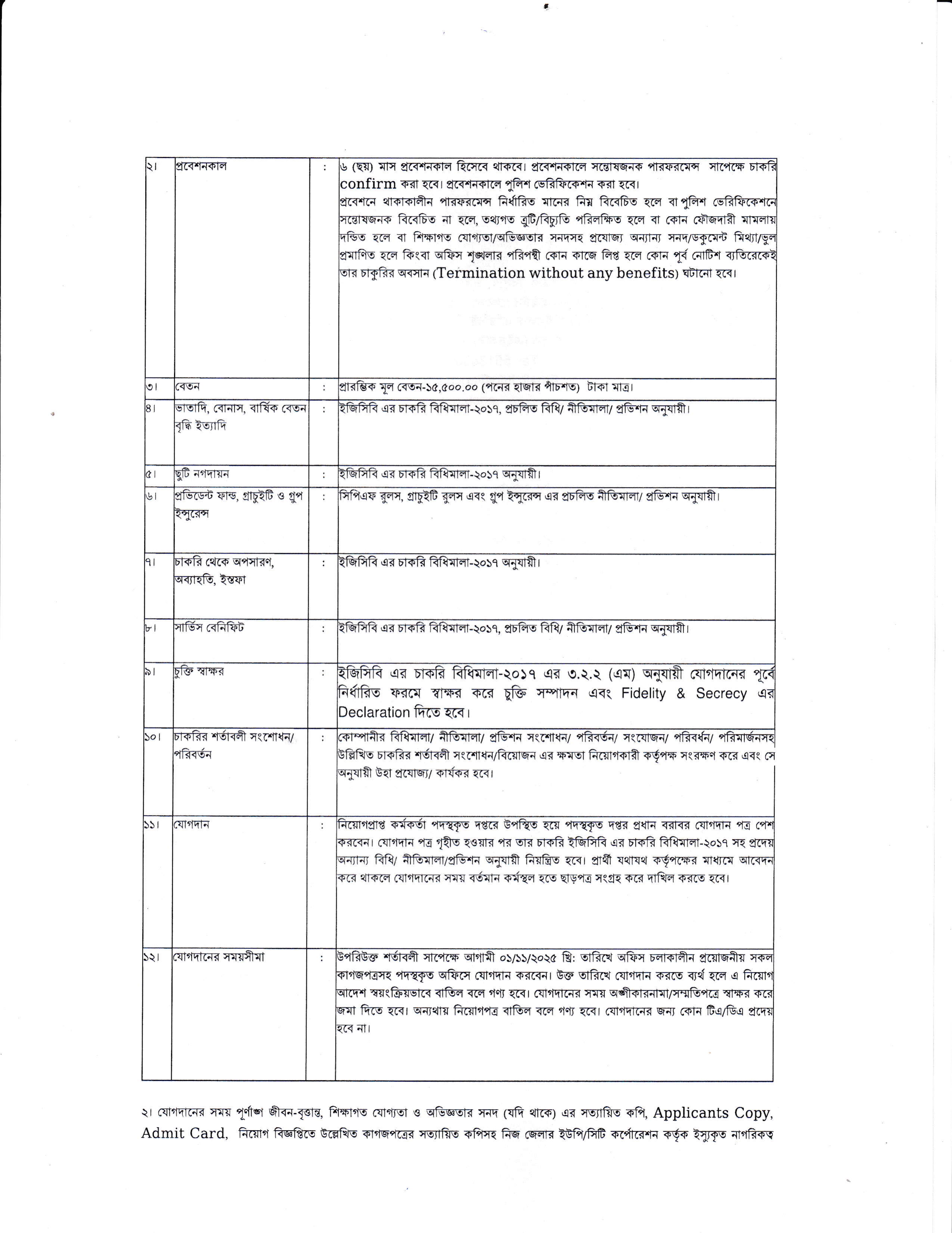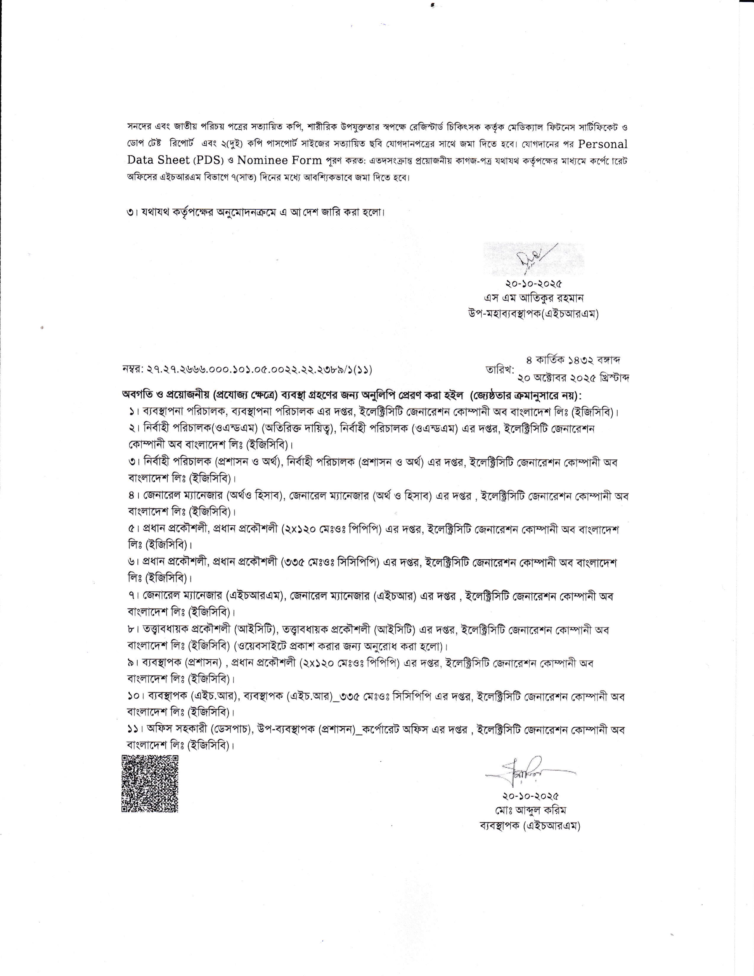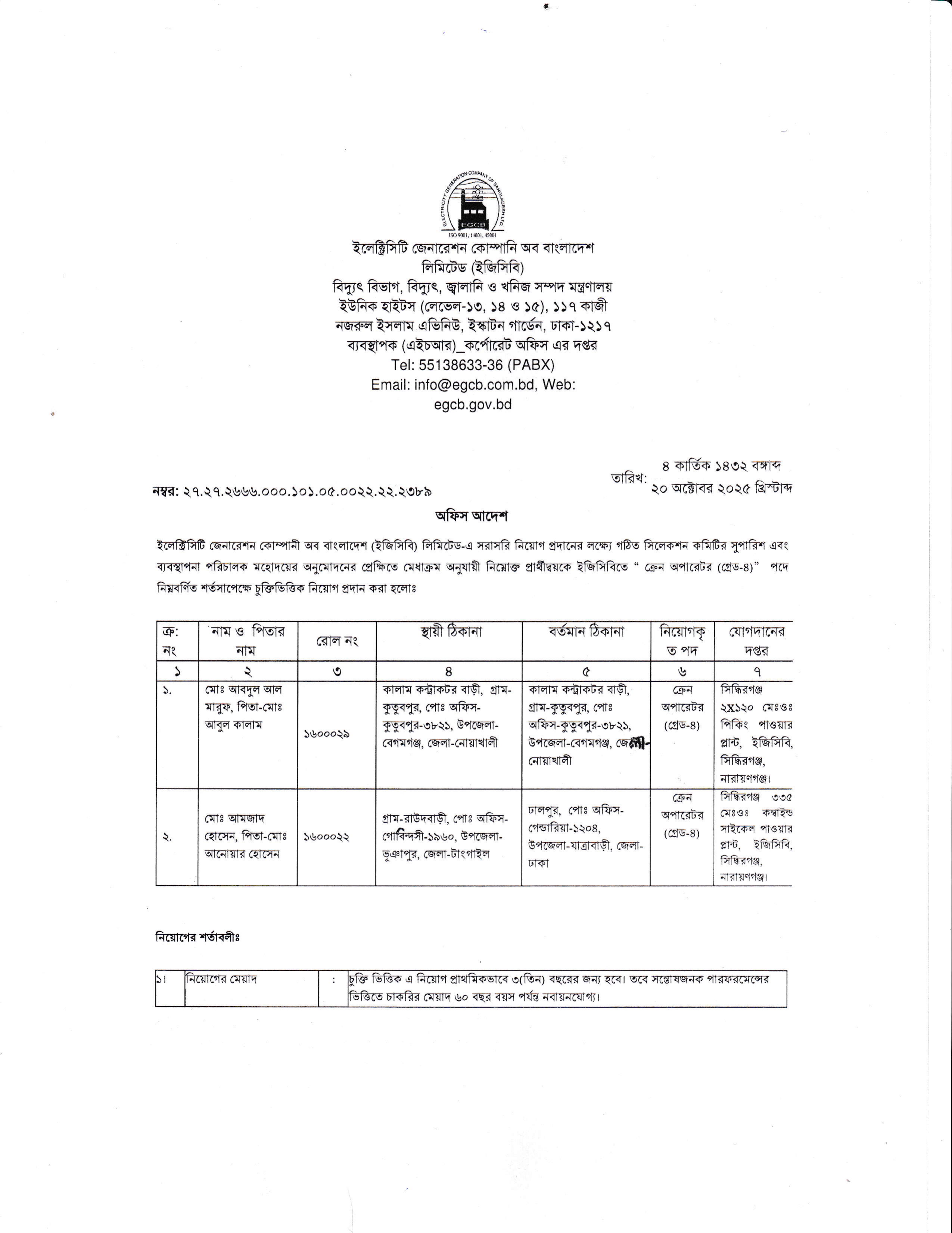 ইলেক্ট্রিসিটি জেনারেশন কোম্পানি অব বাংলাদেশ লিমিটেড (ইজিসিবি) এর “ক্রেন অপারেটর (গ্রেড-৪)” পদে সরাসরি নিয়োগের জন্য অফিস আদেশ প্রকাশ করা হয়েছে। সিলেকশন কমিটির সুপারিশ এবং ব্যবস্থাপনা পরিচালকের অনুমোদনক্রমে মেধাক্রম অনুযায়ী ২ জন প্রার্থীকে এই পদে চুক্তিভিত্তিক নিয়োগ প্রদান করা হয়েছে।