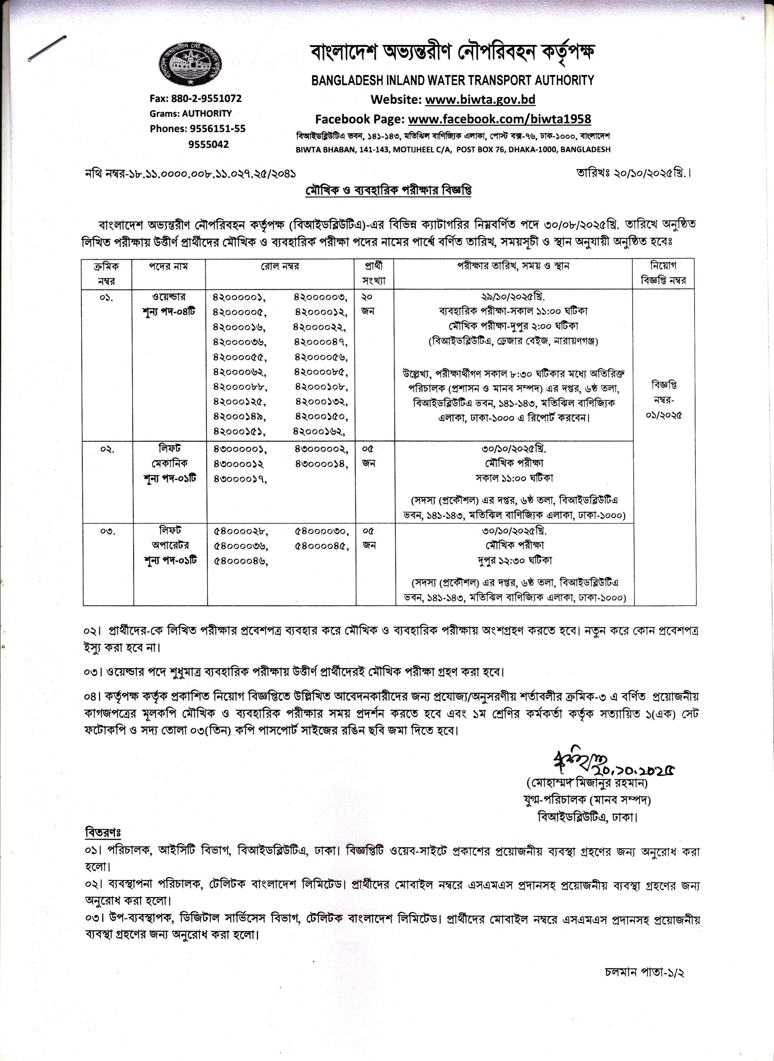 - মৌখিক পরীক্ষা: ২৯/১০/২০২৫ খ্রি., দুপুর ২:০০ ঘটিকা। স্থান: বিআইডব্লিউটিএ, ড্রেজার বেইজ, নারায়ণগঞ্জ।