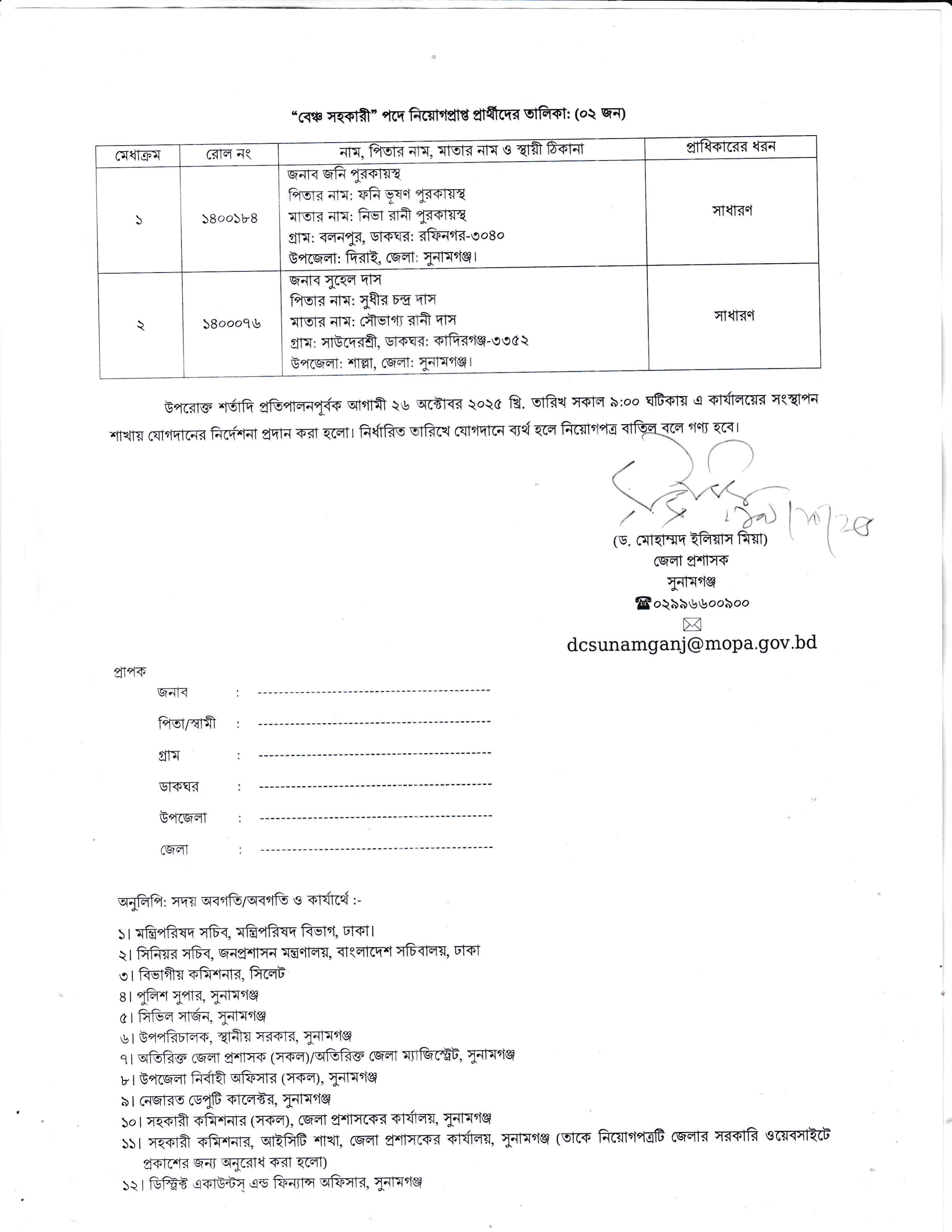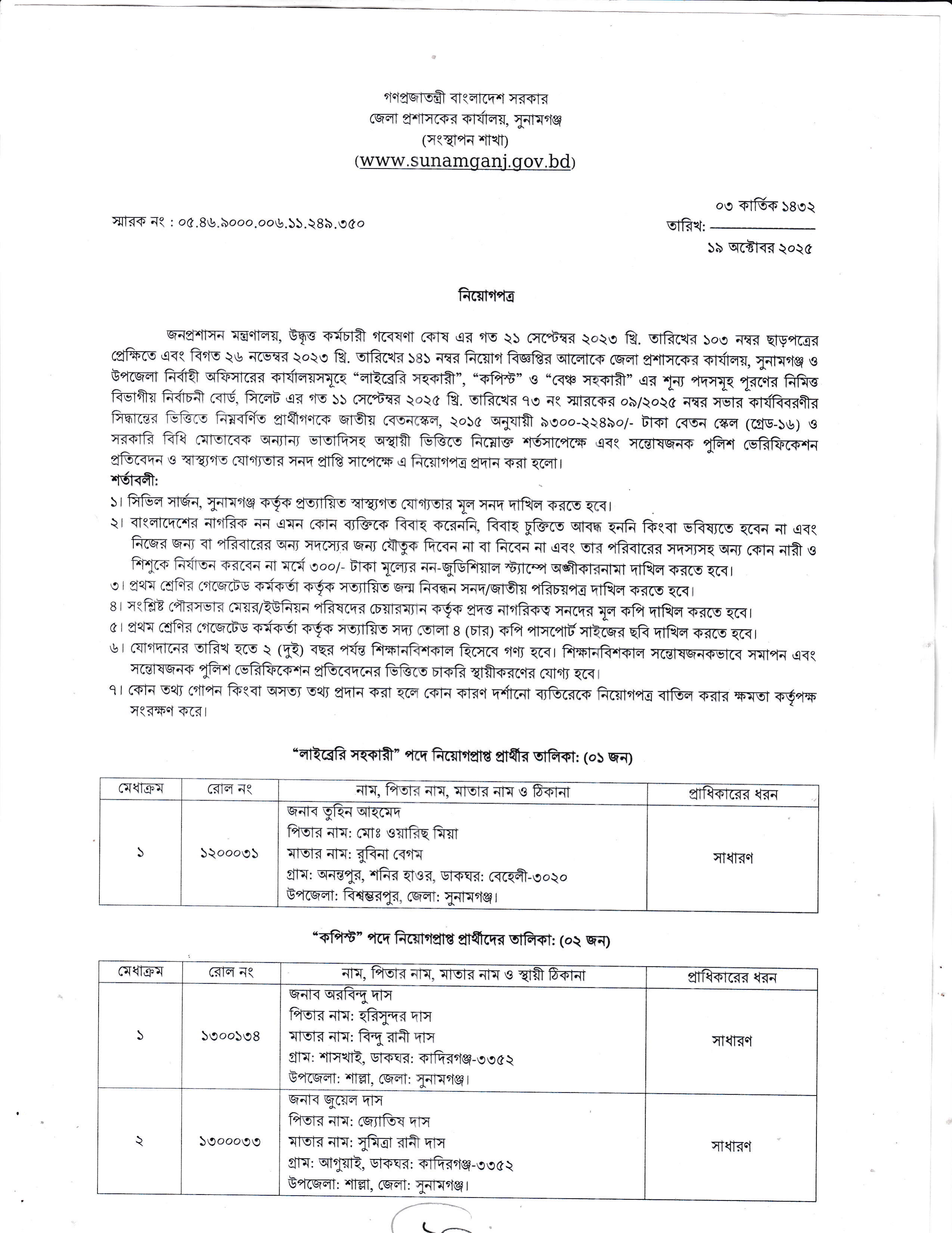 জেলা প্রশাসকের কার্যালয়, সুনামগঞ্জে 'লাইব্রেরি সহকারী', 'কপিস্ট' এবং 'বেঞ্চ সহকারী' পদে মোট ৫ জন প্রার্থীকে অস্থায়ী ভিত্তিতে নিয়োগপত্র প্রদান করা হয়েছে।
