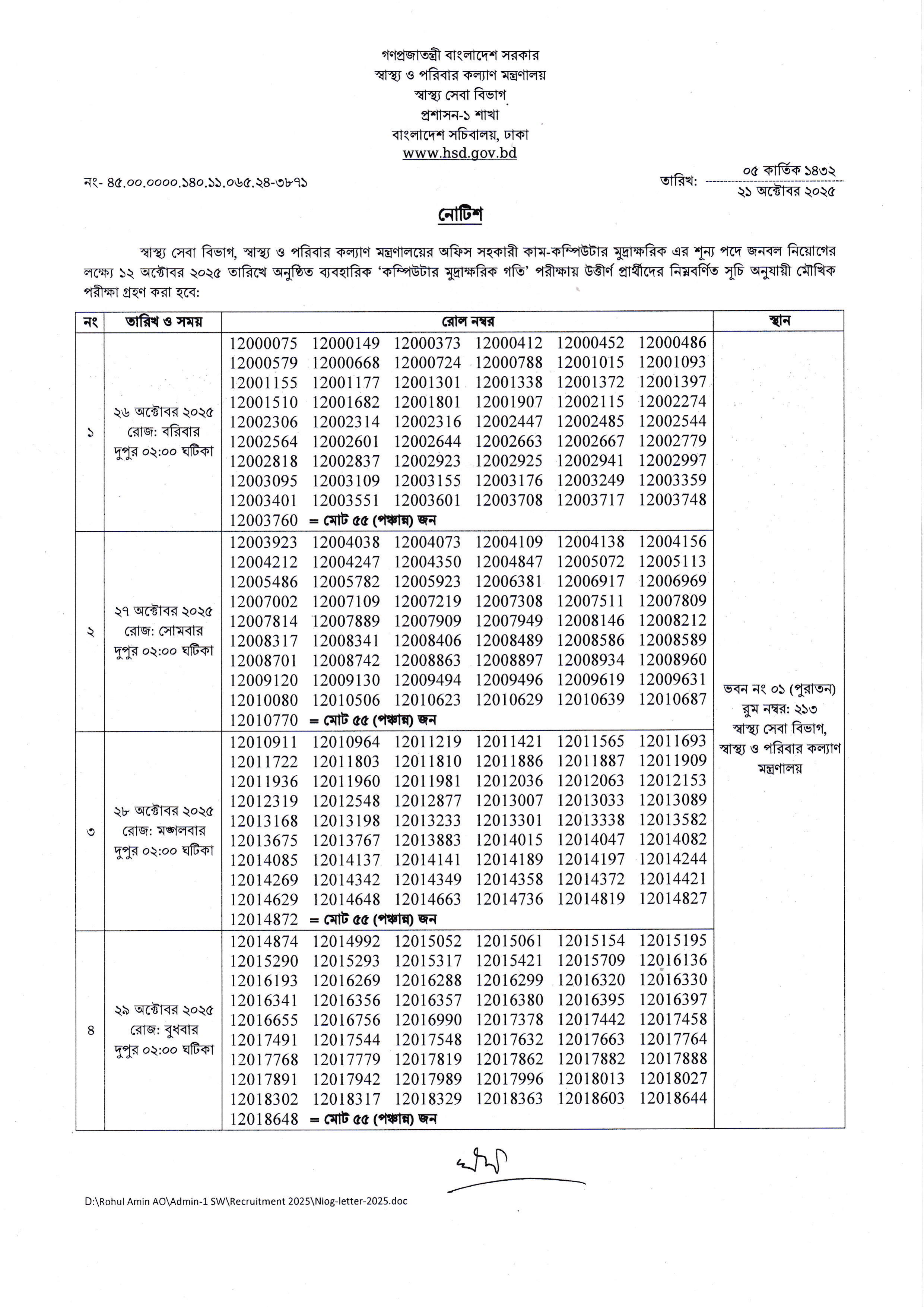 পরীক্ষার স্থান: ভবন নং ০১ (পুরাতন), রুম নম্বর: ২১৩, স্বাস্থ্য সেবা বিভাগ, স্বাস্থ্য ও পরিবার কল্যাণ মন্ত্রণালয়, বাংলাদেশ সচিবালয়, ঢাকা।