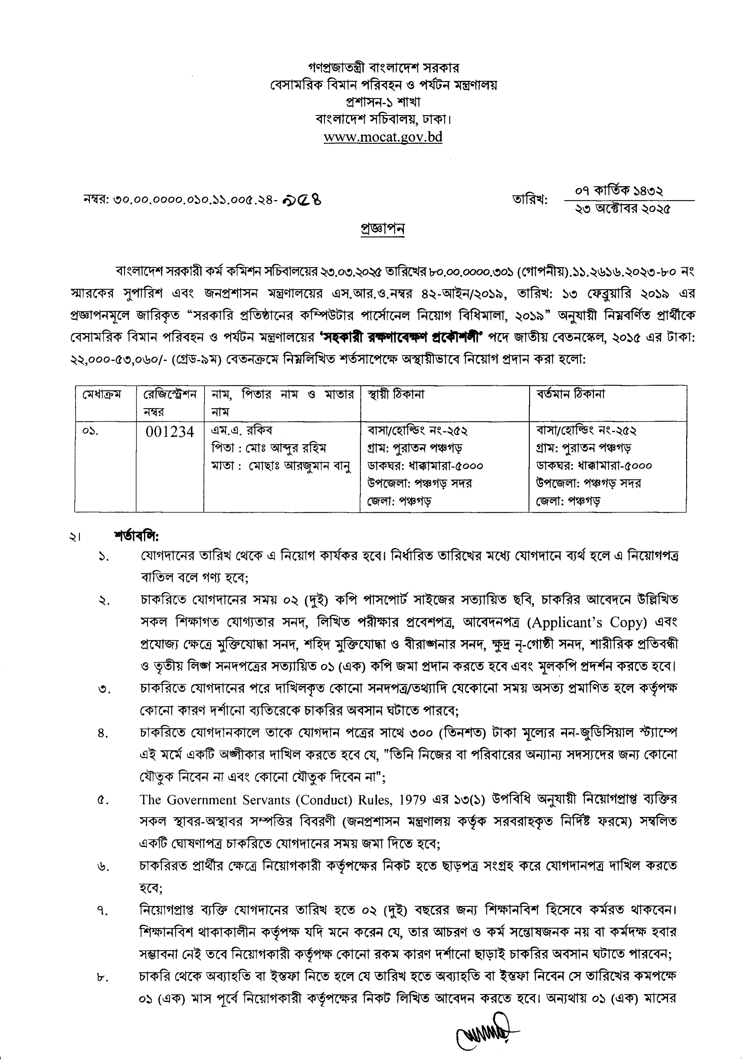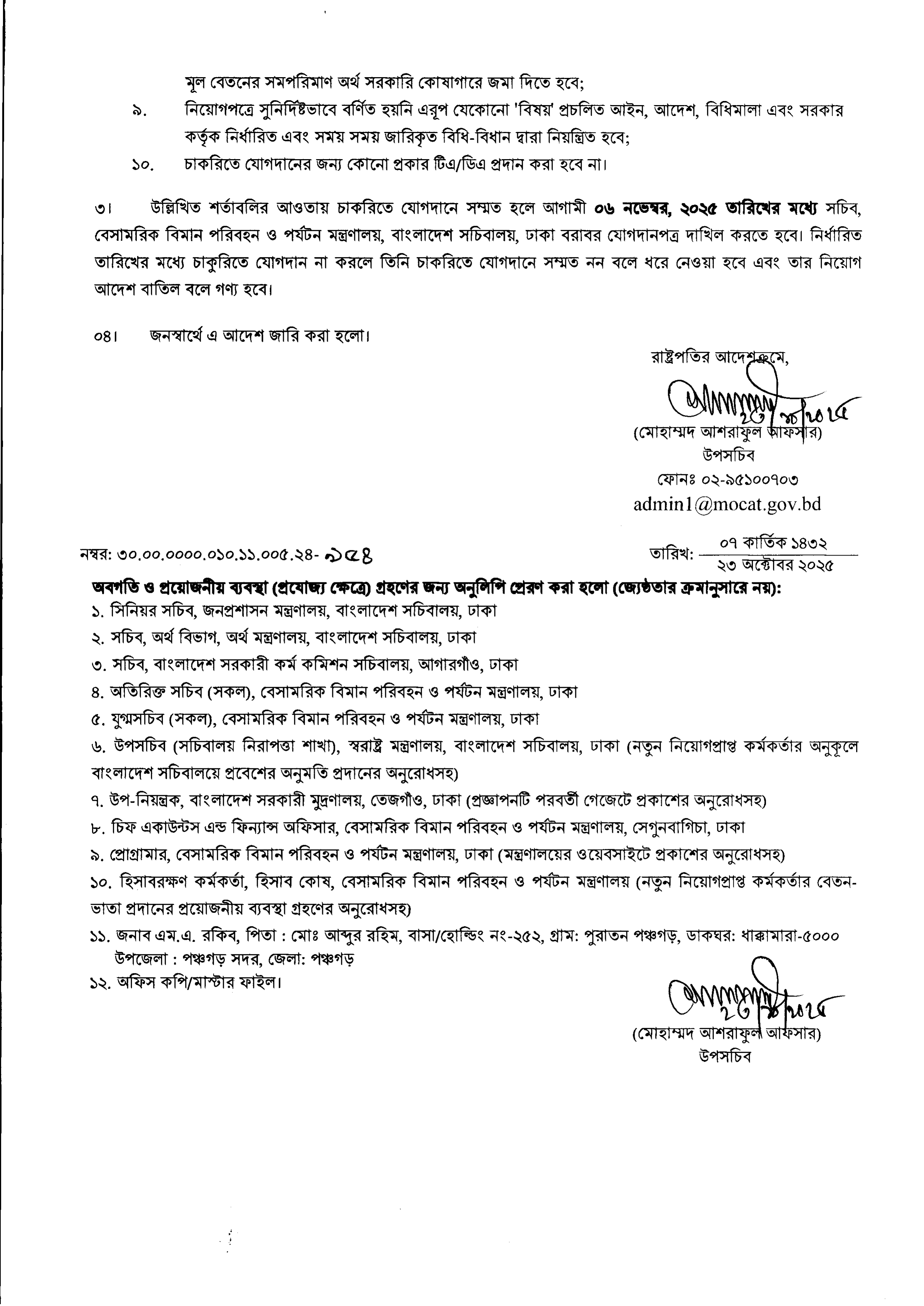 নিয়োগপ্রাপ্ত প্রার্থীকে ০৬ নভেম্বর, ২০২৫ তারিখের মধ্যে সচিব, বেসামরিক বিমান পরিবহন ও পর্যটন মন্ত্রণালয় বরাবর যোগদানপত্র দাখিল করতে হবে।