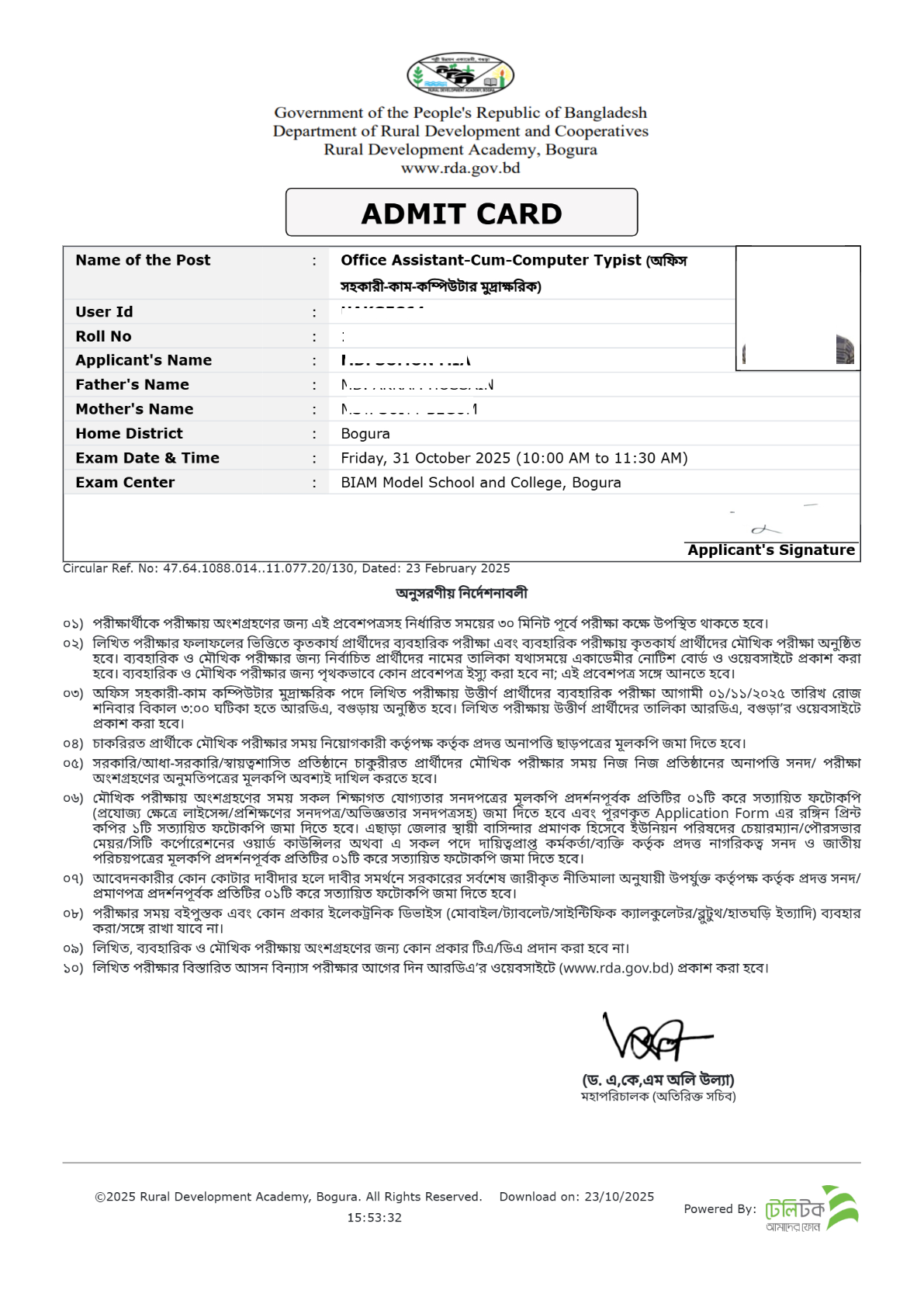 ৫৪ পদে পল্লী উন্নয়ন একাডেমি (আরডিএ) বগুড়া এর চাকরির পরীক্ষার সময়সূচি ও এডমিট কার্ড প্রকাশ