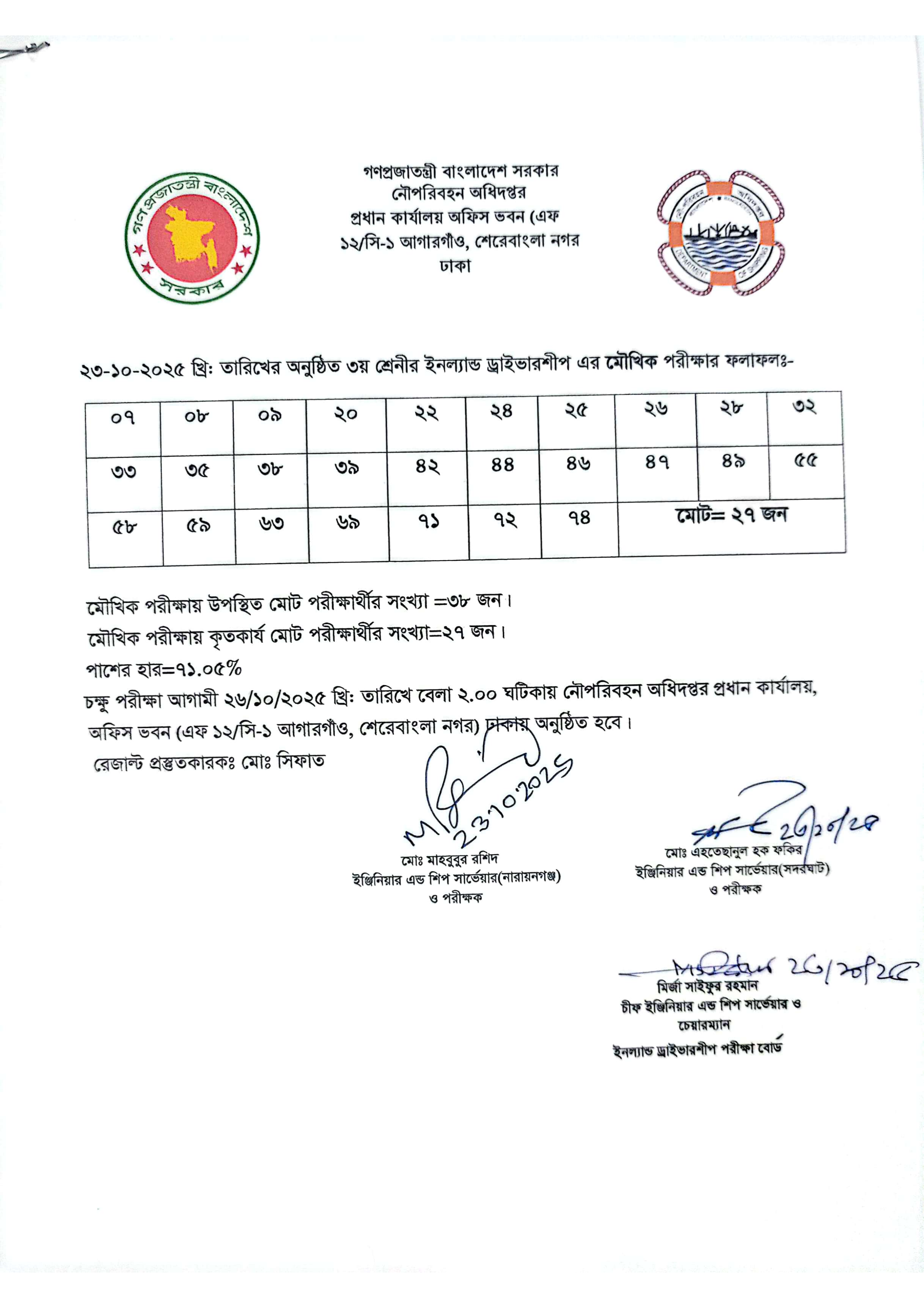 নৌপরিবহন অধিদপ্তর সম্প্রতি তাদের মৌখিক পরীক্ষার ফলাফল প্রকাশ করেছে। এই পরীক্ষায় মোট ২৭ জন প্রার্থী কৃতকার্য হয়েছেন।
